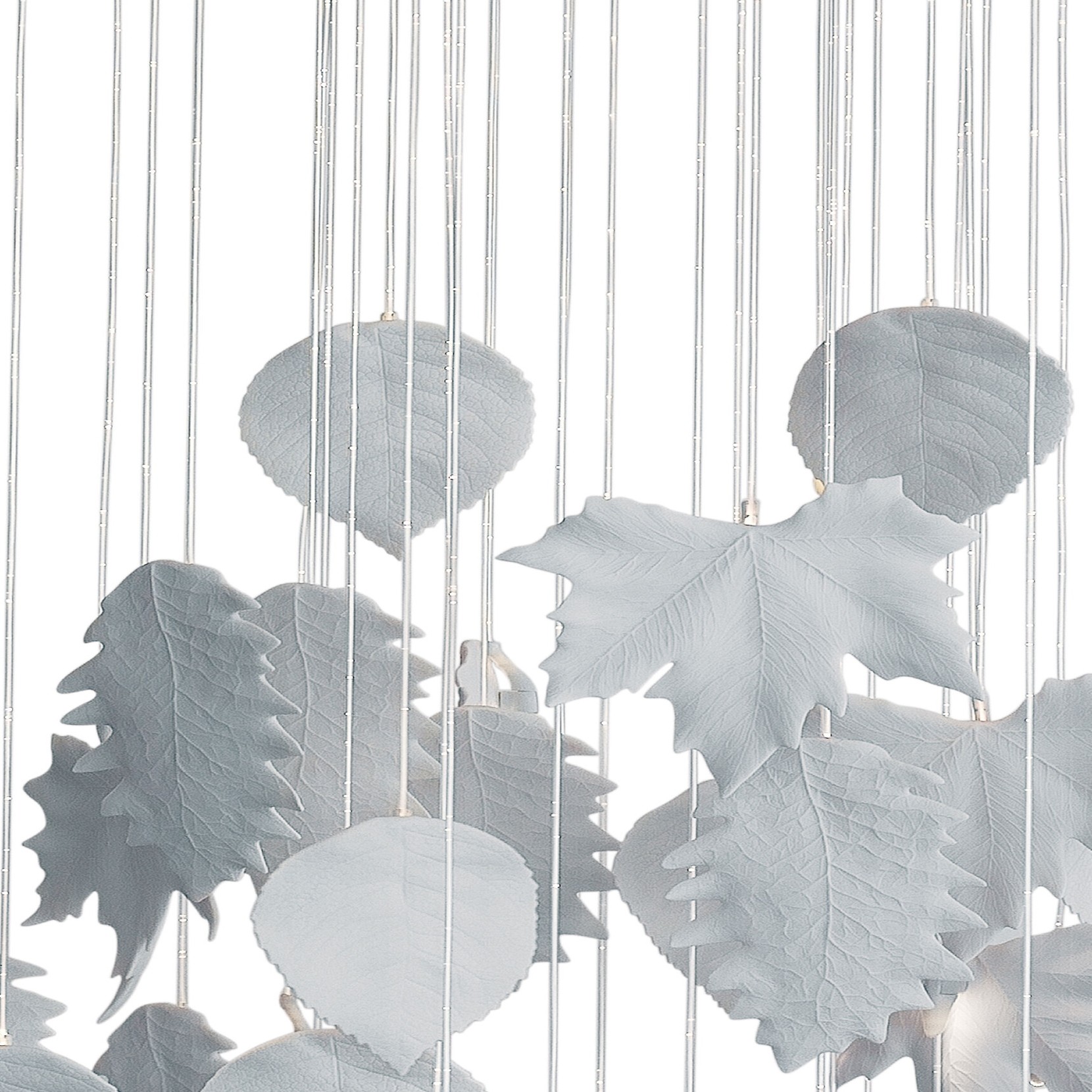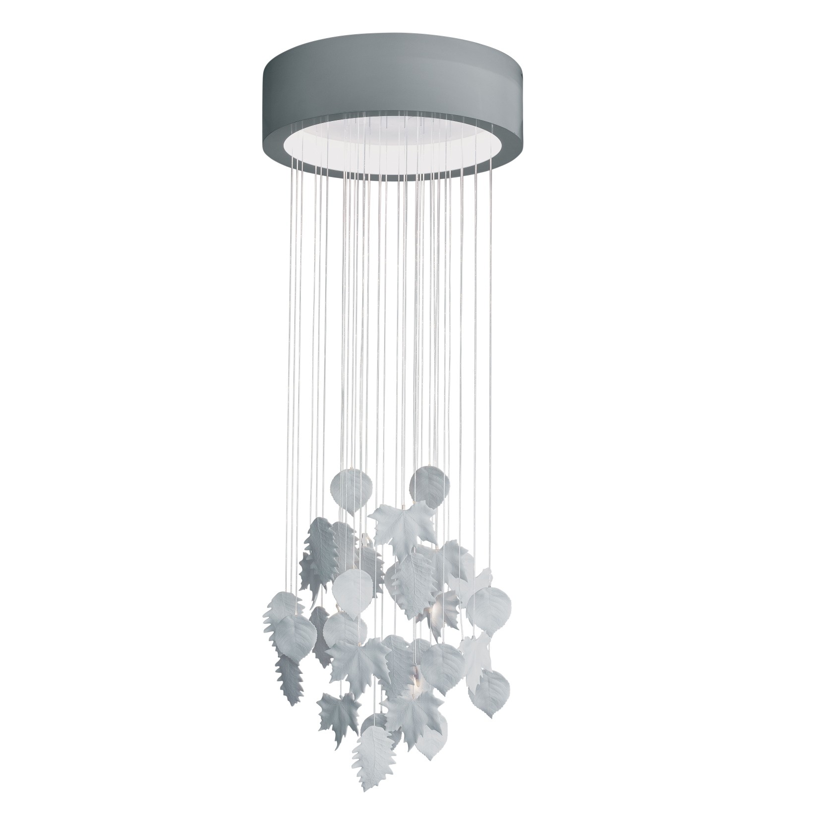 Lampe à suspension avec des feuilles en porcelaine opaque blanches réalisées à la main et suspendues à une fibre optique avec de petits points de lumière presque pour former une cascade. Conçu par Bodo Sperlein. Dans le cadre du projet Re-Cyclos, lallemand créatif Bodo Sperlein, inspiré par limportance de la nature dans luvre Lladró, crée des lustres absolument contemporains avec un nouveau rôle et un nouveau message. Chacune de ces feuilles est faite à la main, en suivant le processus entièrement artisanal inhérent à Lladró, pure créativité, combinée avec la dernière technologie en fibre optique pour créer des points lumineux subtils qui rendent les feuilles vivantes. Disponible en plusieurs tailles.