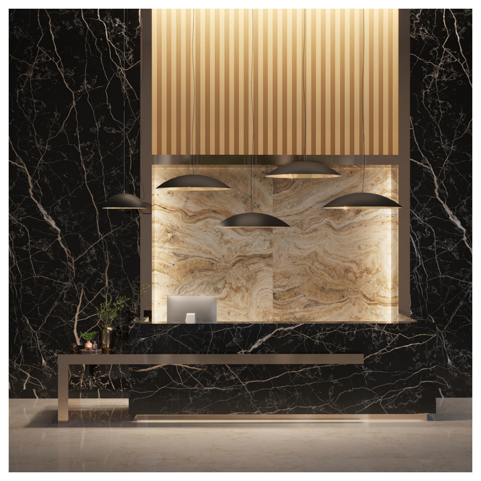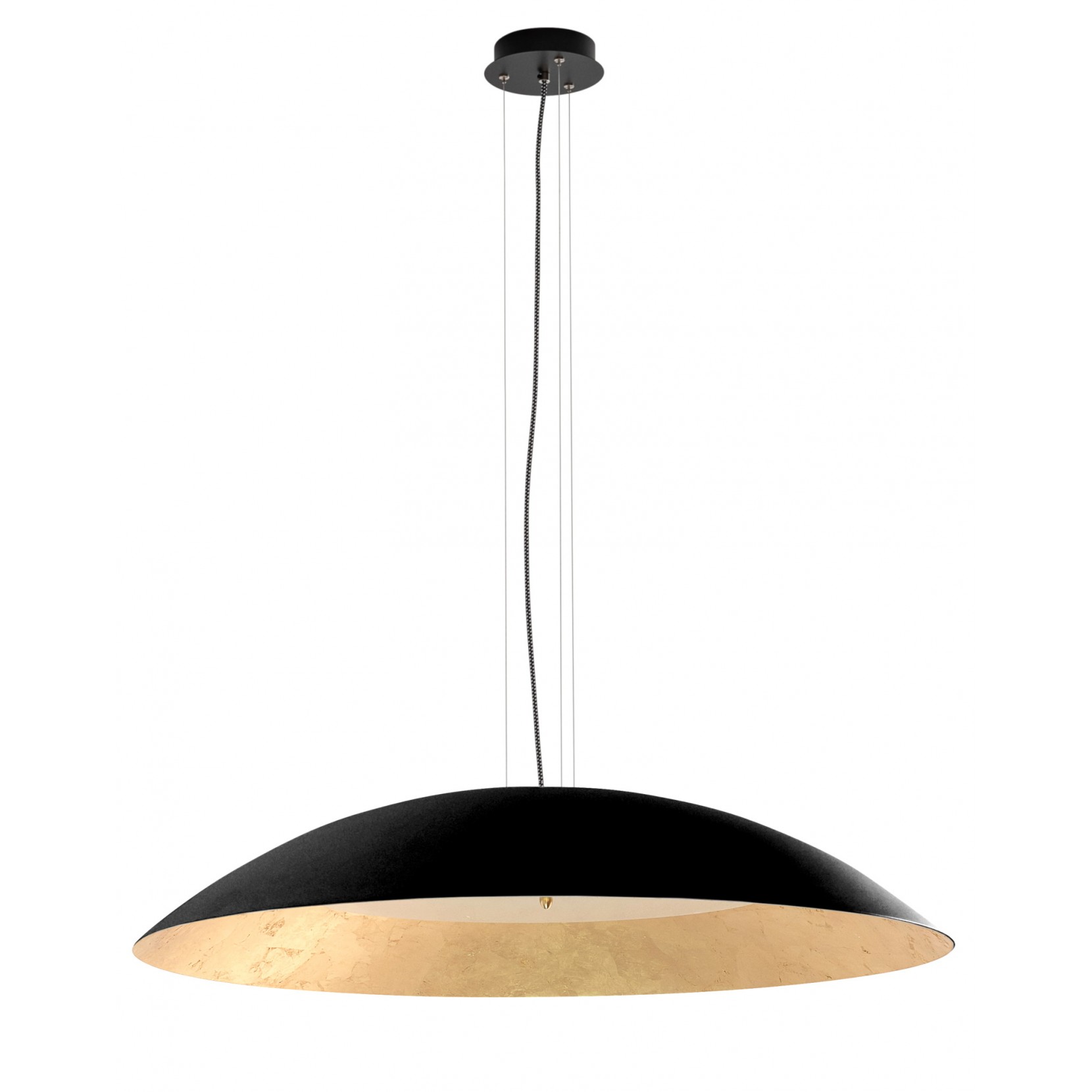 Hind Rabii propose la lampe à suspension OND’A L. La lampe OND’A L est composée de la structure externe en noir ou blanc mat. L’éclat brillant brille lorsque la lumière est allumée, grâce à la finition en feuille d’or, d’argent ou de cuivre à l’intérieur de l’abat-jour qui sont insérés à la main.