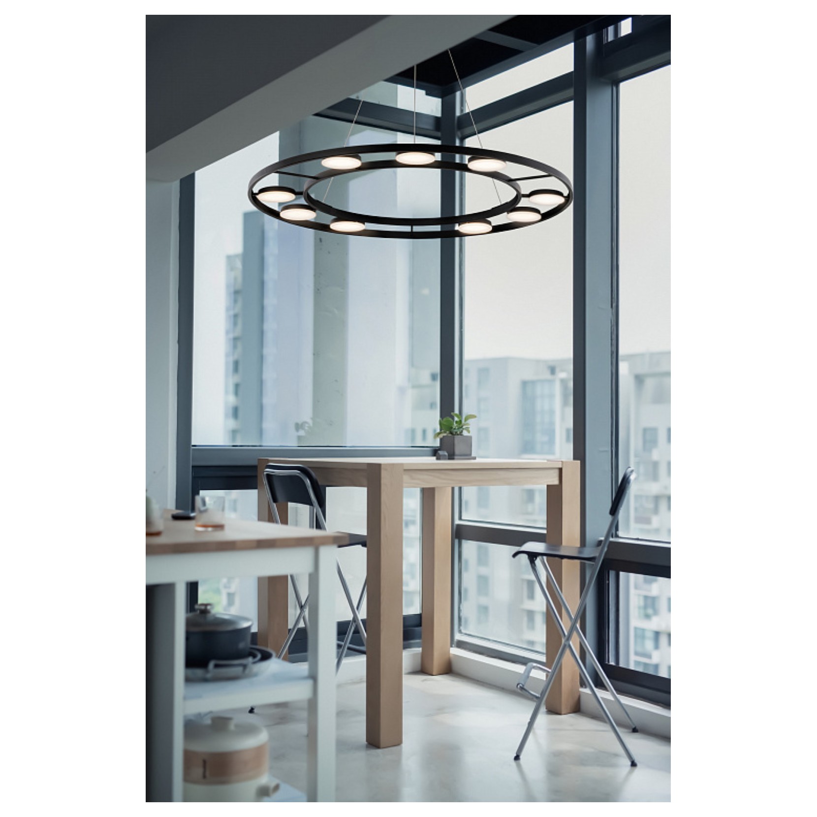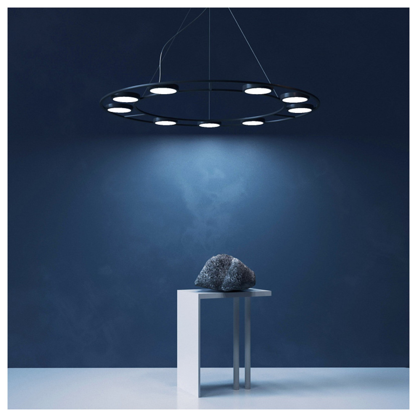 La lampe à suspension FAD se présente avec des diffuseurs cylindriques qui tournent à 340 degrés dans le plan horizontal et à 90 degrés dans le plan vertical. La structure de la lampe est en métal noir. En regardant la lampe, vous avez limpression de regarder un disque tournoyant dans le plafond de la maison.