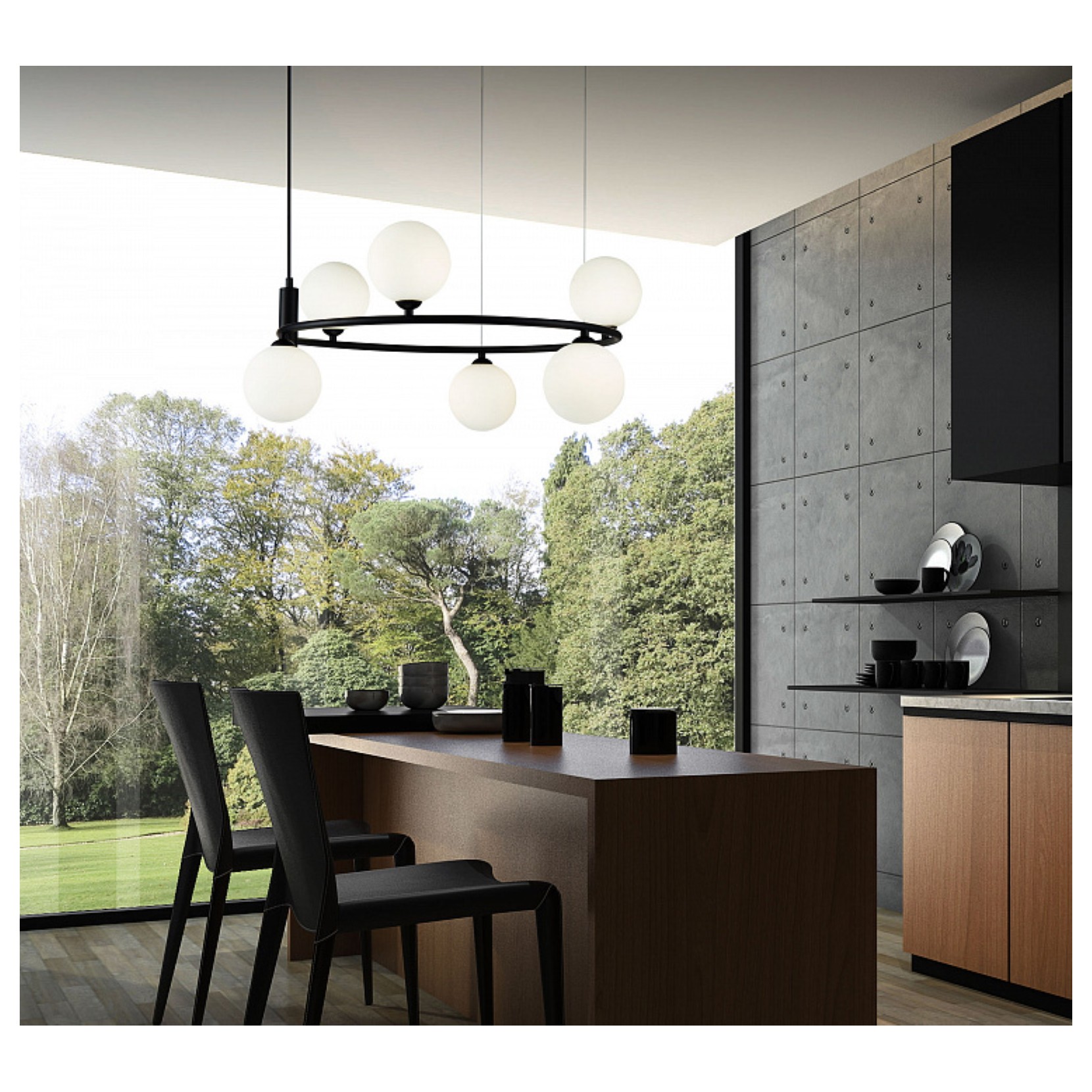 La suspension RING combine deux matériaux : le verre et le métal. Ring se présente avec une structure en métal en laiton, blanc ou noir entourée d’abat-jour en verre gravé à l’acide.