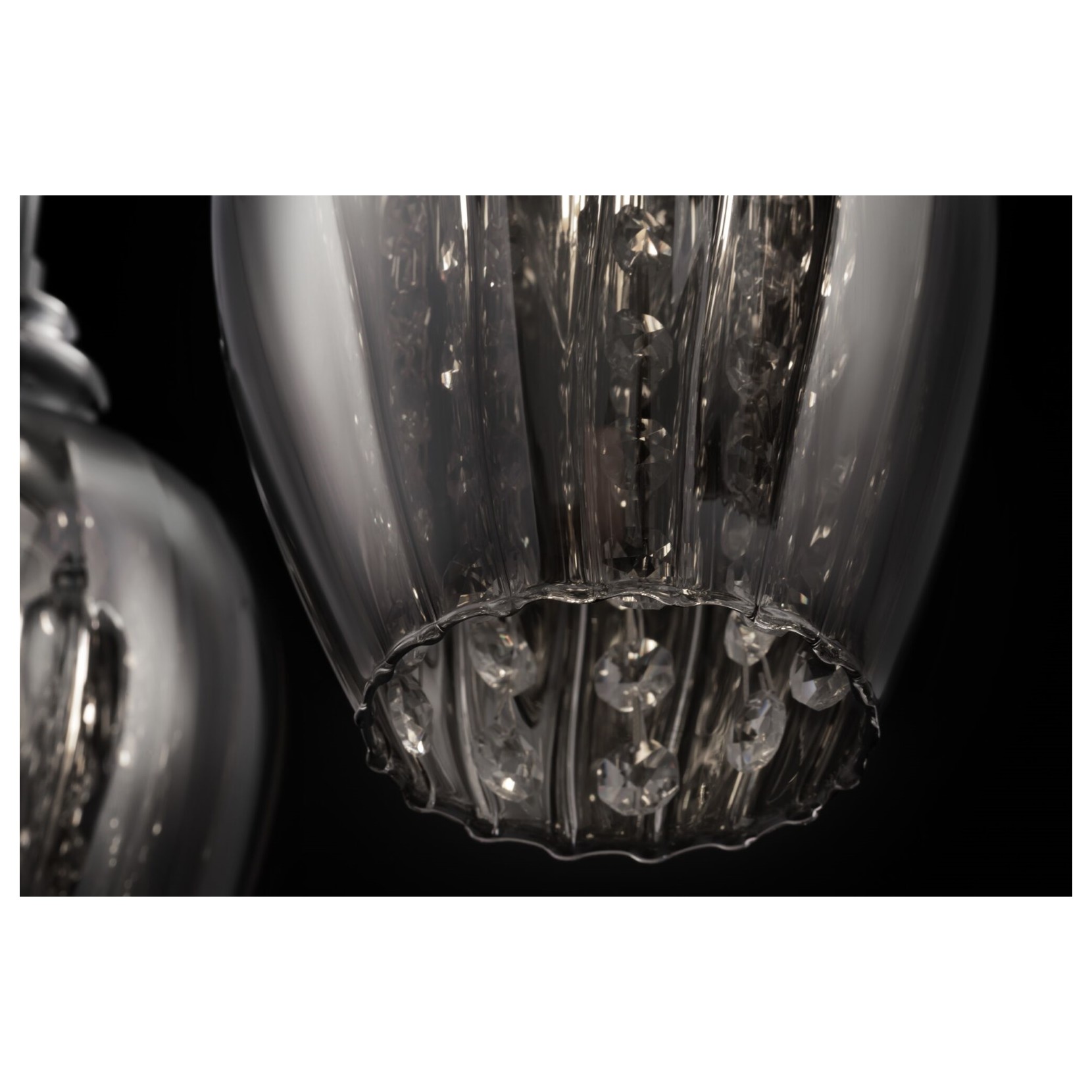 La lampe à suspension BLUES représente lessence de lélégance. La structure en métal chromé de Blues est ornée dun diffuseur en verre soufflé fumé où se trouvent à lintérieur des pendentifs décoratifs en cristal.