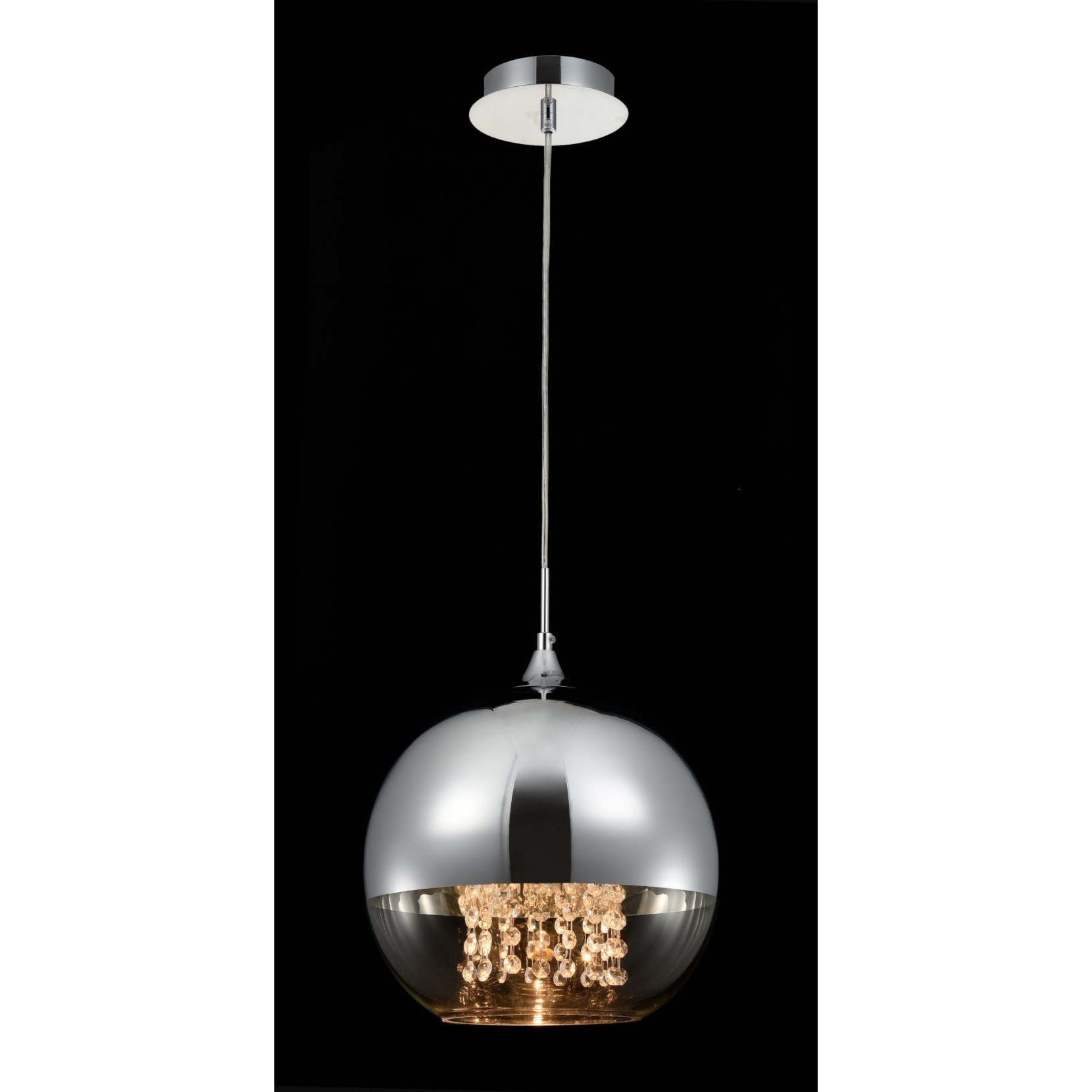FERMI est la suspension avec structure en métal et diffuseurs or ou chrome, l’abat-jour en verre avec cristaux décoratifs.