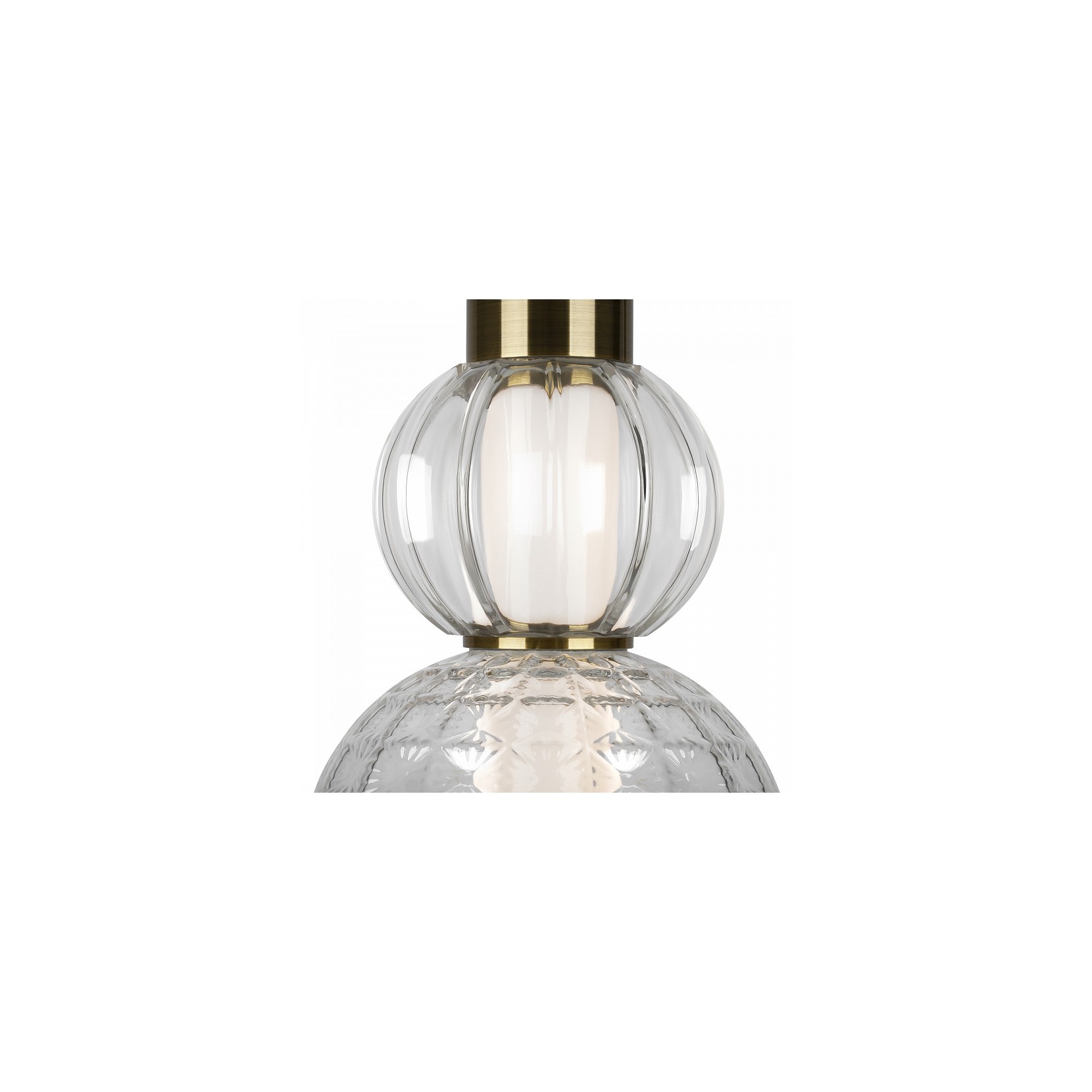 La suspension COLLAR dune élégance particulière voit la combinaison de 3 types : verre transparent avec un dessin vertical, verre opale et une sphère avec un motif géométrique transparent. La hauteur de Collar est réglable par la longueur de la corde.