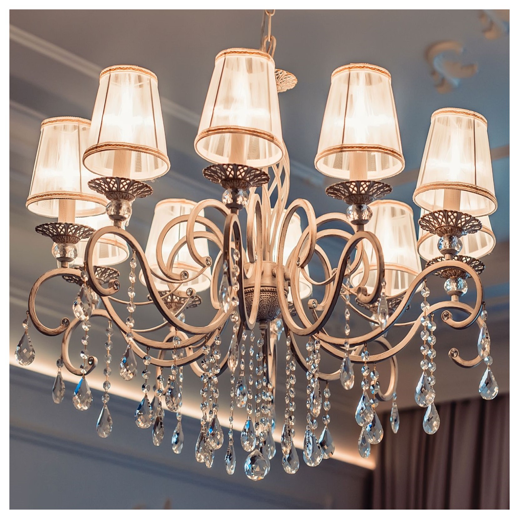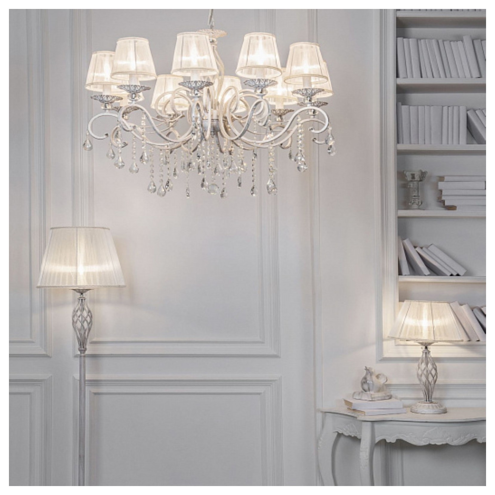 La suspension Grace se compose dune structure en métal blanc et or. La structure particulière se compose de dix abat-jours en organza blanc avec des éléments décoratifs en cristal.