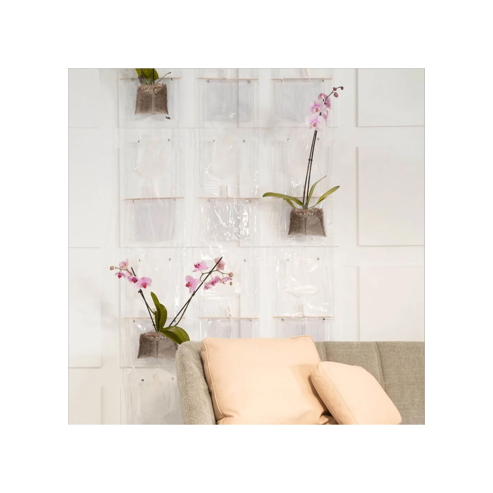 Élément en plastique transparent composé de 4 enveloppes de confinement pour les plantes et de distribution d’eau. Usage interne seulement.