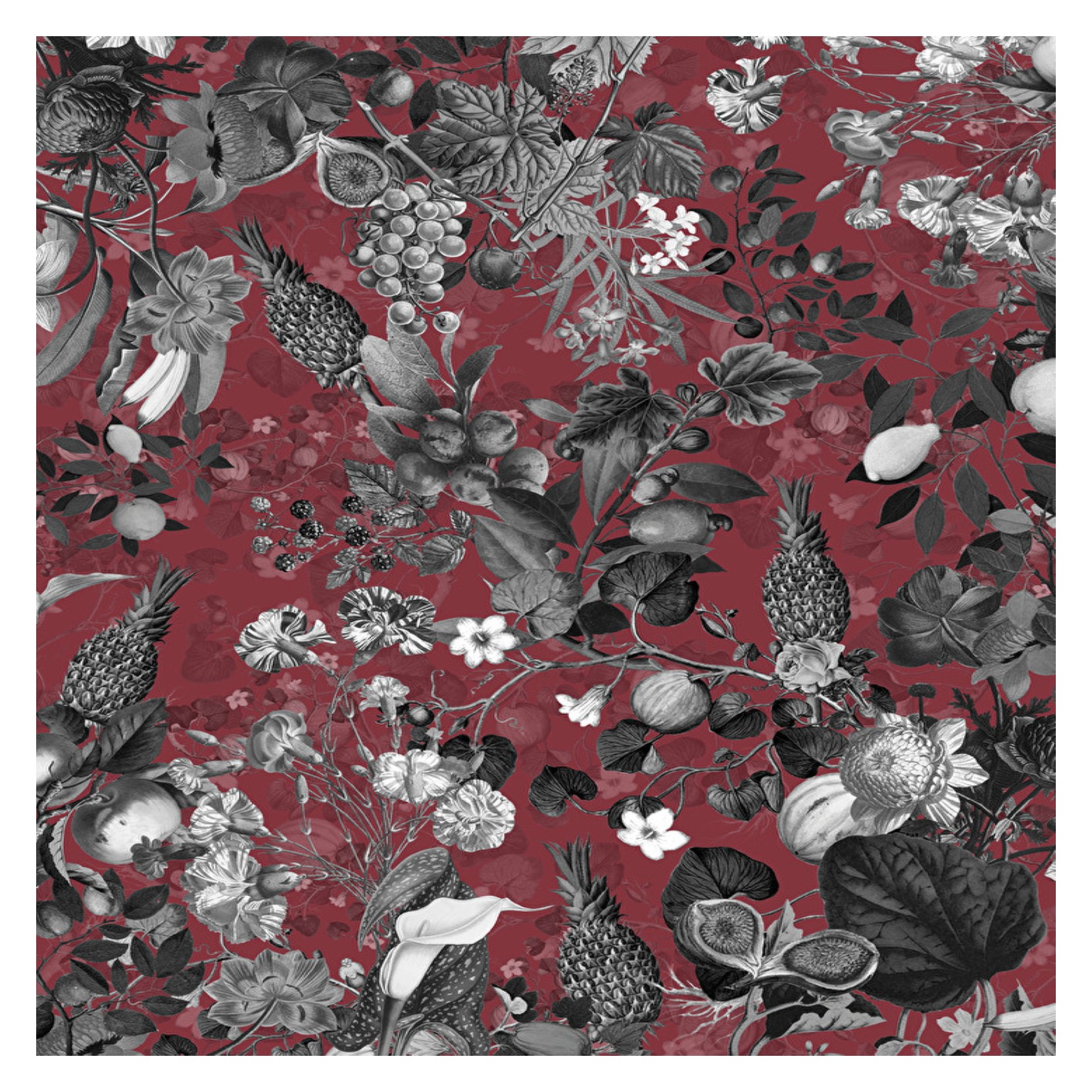 Papier peint très spécial, un trip de fleurs, de plantes et de fruits exotiques. La version extra-large est disponible en cinq variantes chromatiques.