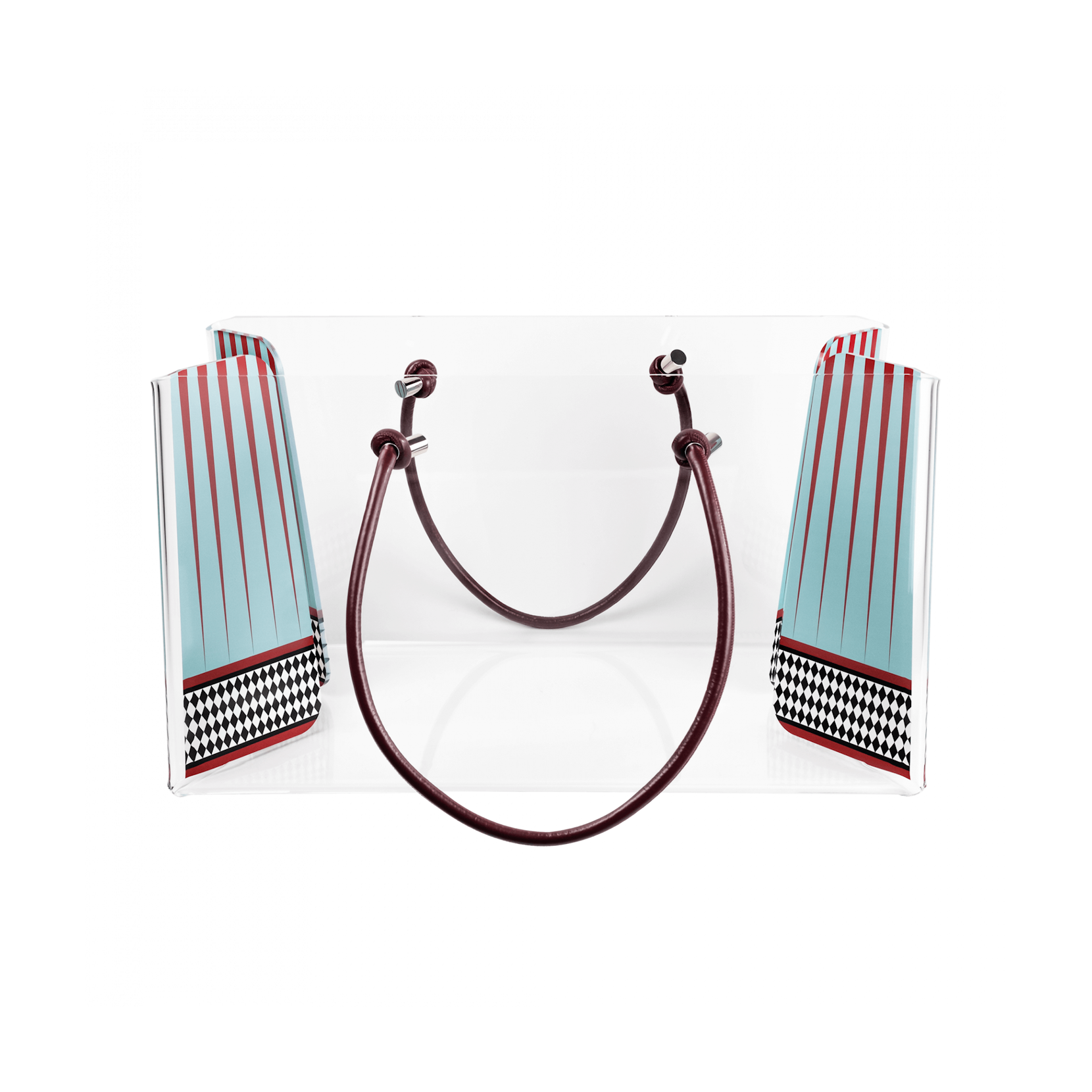 VESTA riesca a rendere ogni parte della casa unica e questa volta lo fa con il portaoggetti CHARLOTTE, il suo design originale e iconico lo rende un elemento darredo pratico che funge da contenitore multiuso. La struttura è realizzata in acrilico resistente è arricchita da manici in pelle che gli danno un tocco di eleganza.