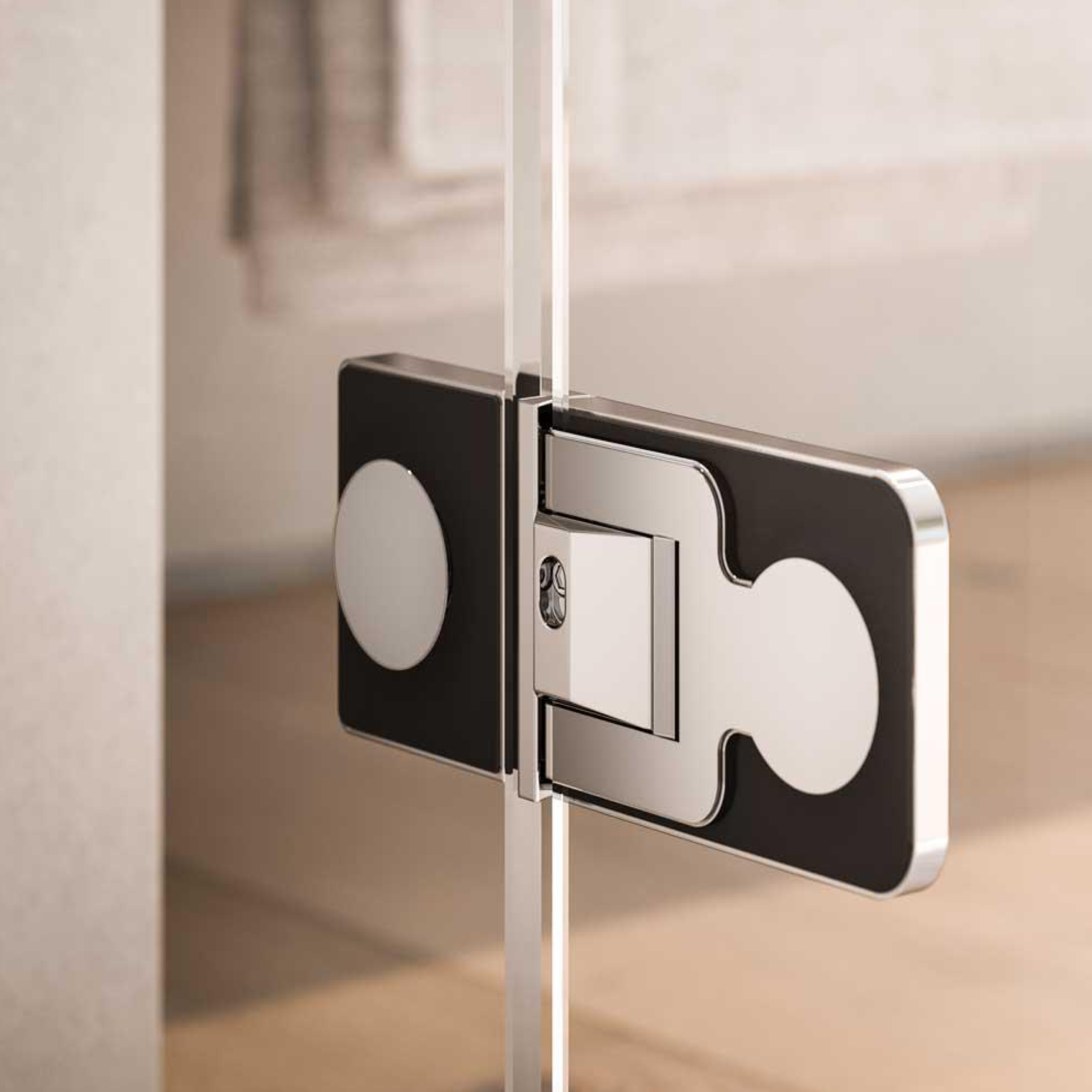 Porta con laterale, caratterizzata da una cerniera senza viti a vista per la massima pulizia e trasparenza.