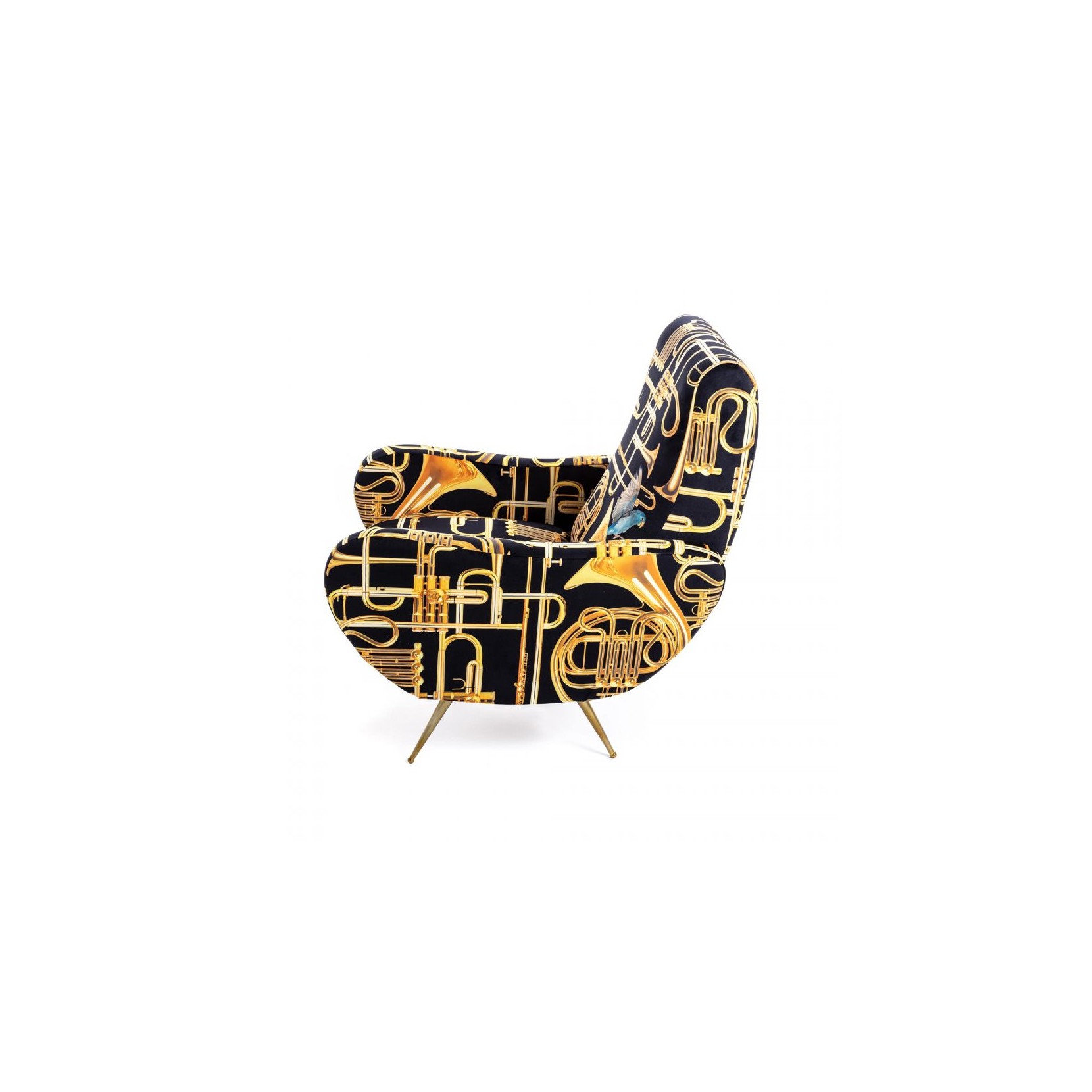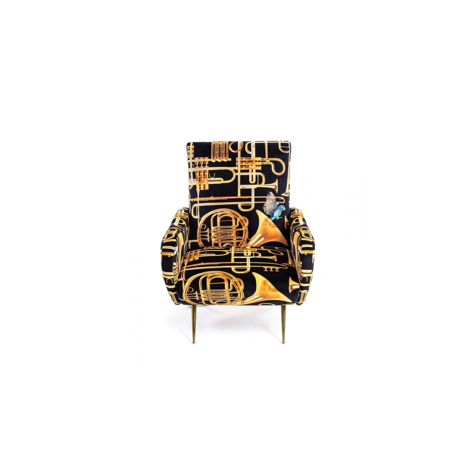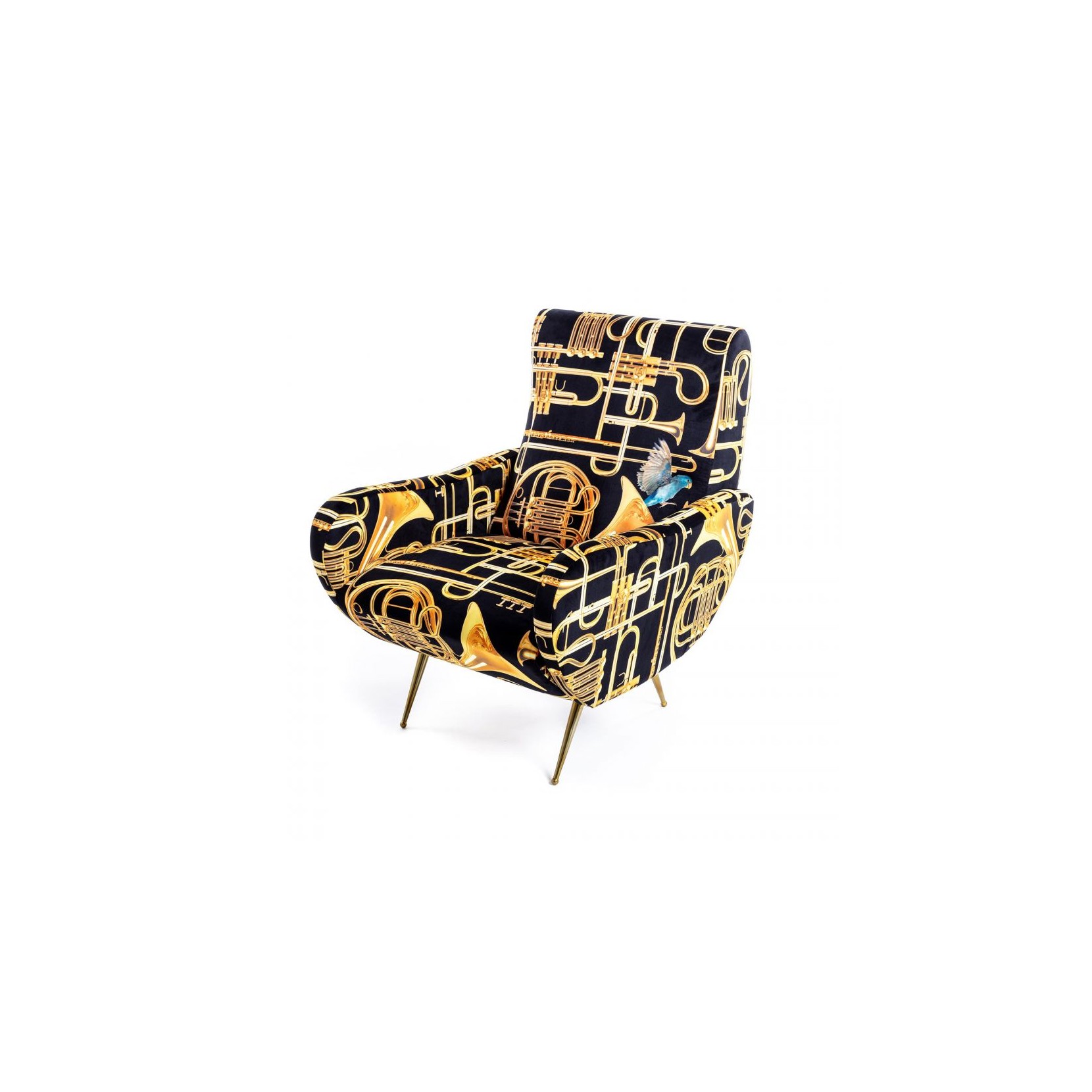 SELETTI con la serie di poltrone disegnate dall'designer Toiletpaper rende omaggio alla tradizionale poltrona in stile anni '50 con immagini stravaganti.