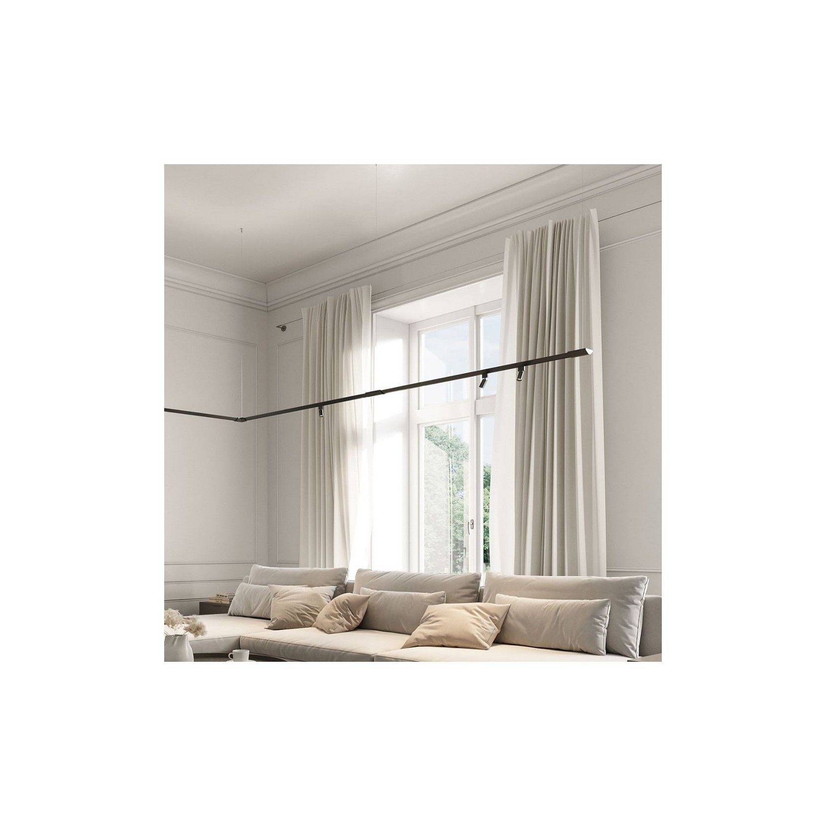 Una struttura in alluminio sospesa e componibile, grazie ai giunti angolari e lineari, e sistema di scorrimento che permette di inserire i faretti dalla parte inferiore. La lampada Turn It, grazie alla sua modularità, permette di comporre e configurare la luce secondo ogni preferenza o esigenza.