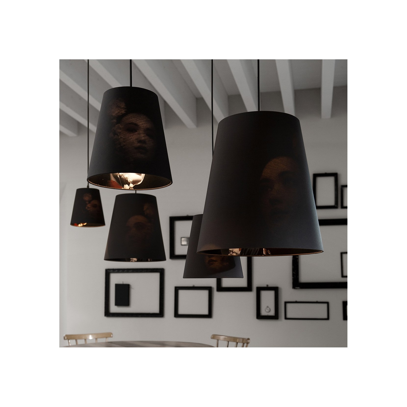 Una lunga barra led in allumino nero opaco arricchita eventualmente da uno o più paralumi in tessuto raffiguranti visi di geishe. Cupido è una lampada dalla luce delicata e rappresenta l'unione tra oriente e occidente, il minimale e la tradizione.