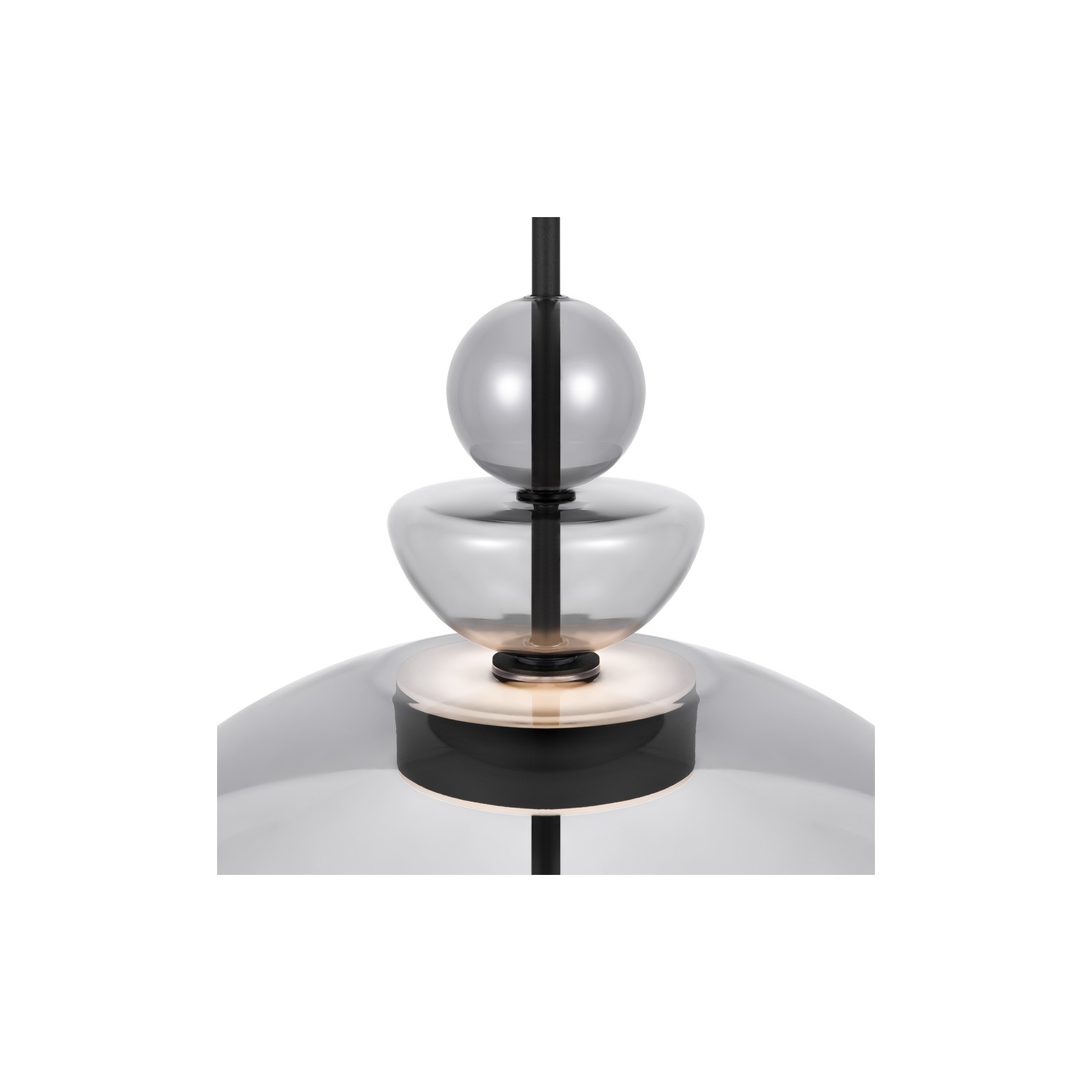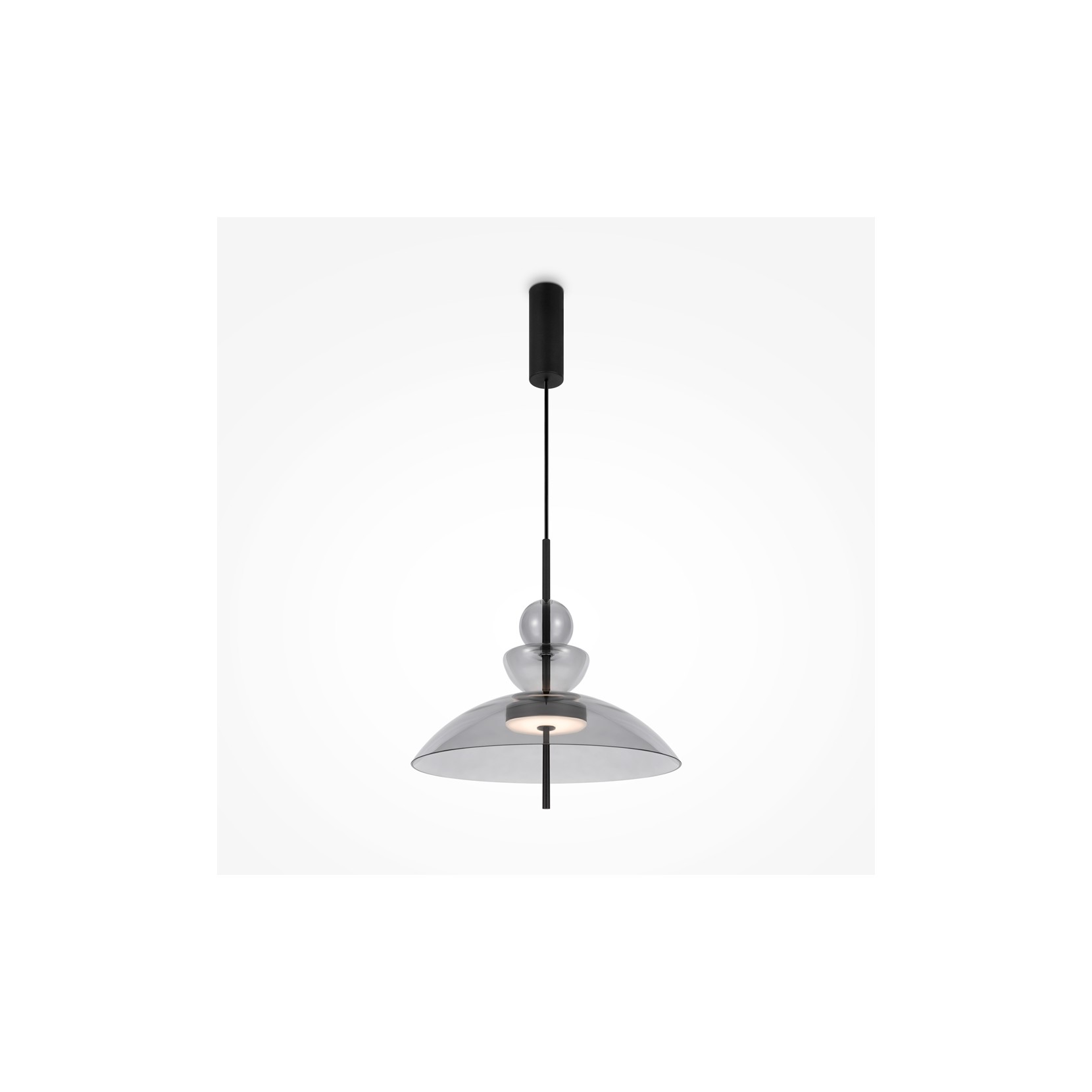 L'armatura è in metallo di colore nero, con un design minimalista di lampade in vetro disponibili in tre colori: fumoso, trasparente e grigio.