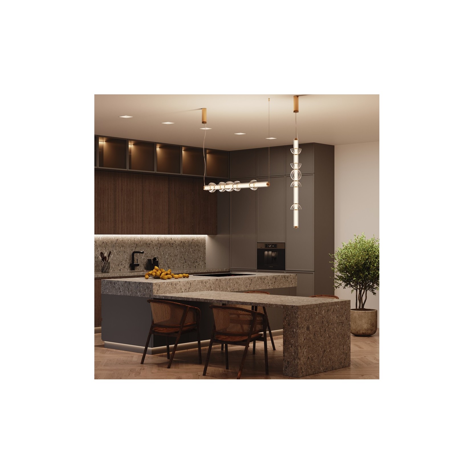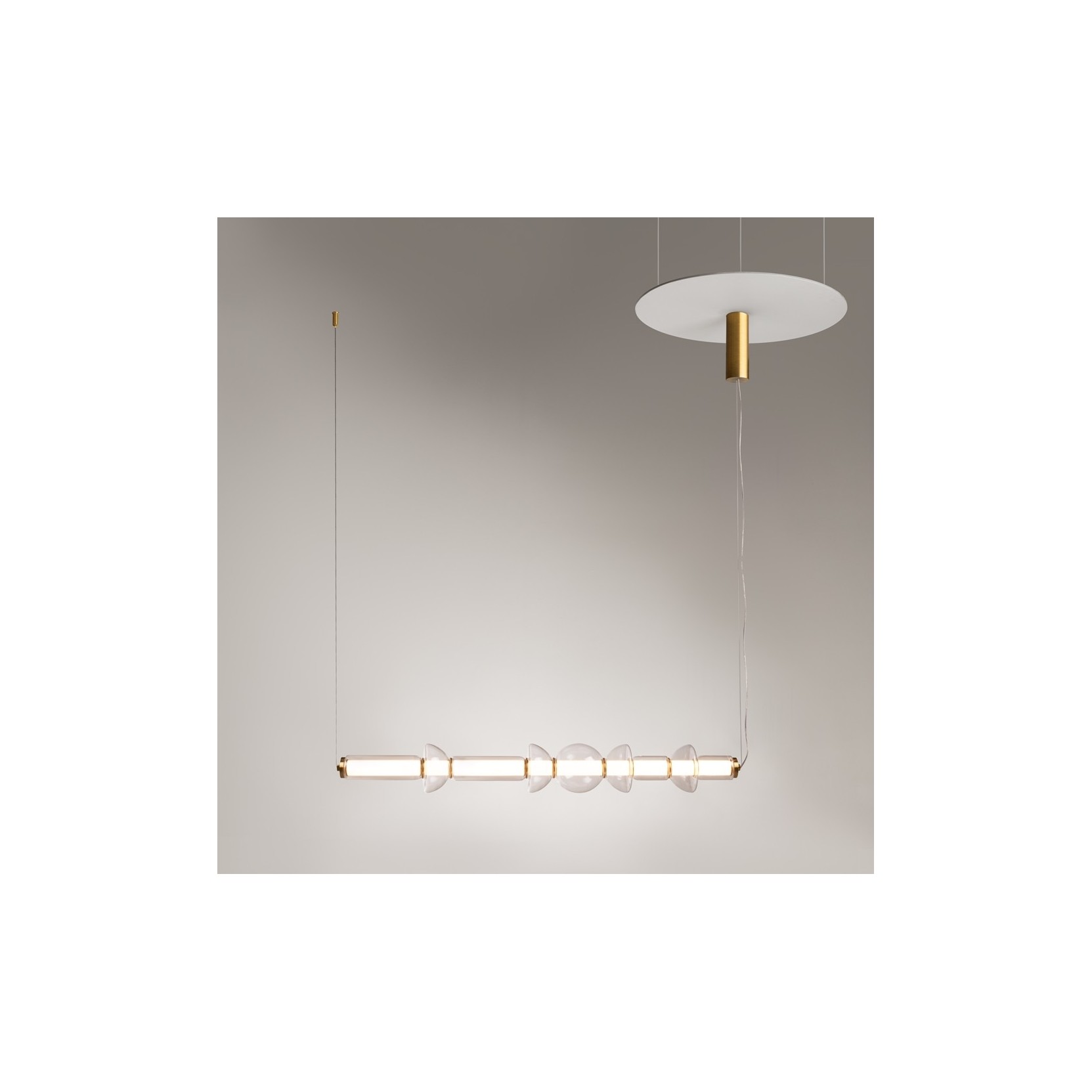 Eleva il concetto di illuminazione lineare con la sospensione Cosmo, un’opera d’arte sospesa che sfida le convenzioni del design minimale. Questa lampada non è un semplice profilo luminoso, ma una scultura architettonica composta da una sequenza ritmata di cilindri e sfere in vetro soffiato che sembrano fluttuare nel vuoto.