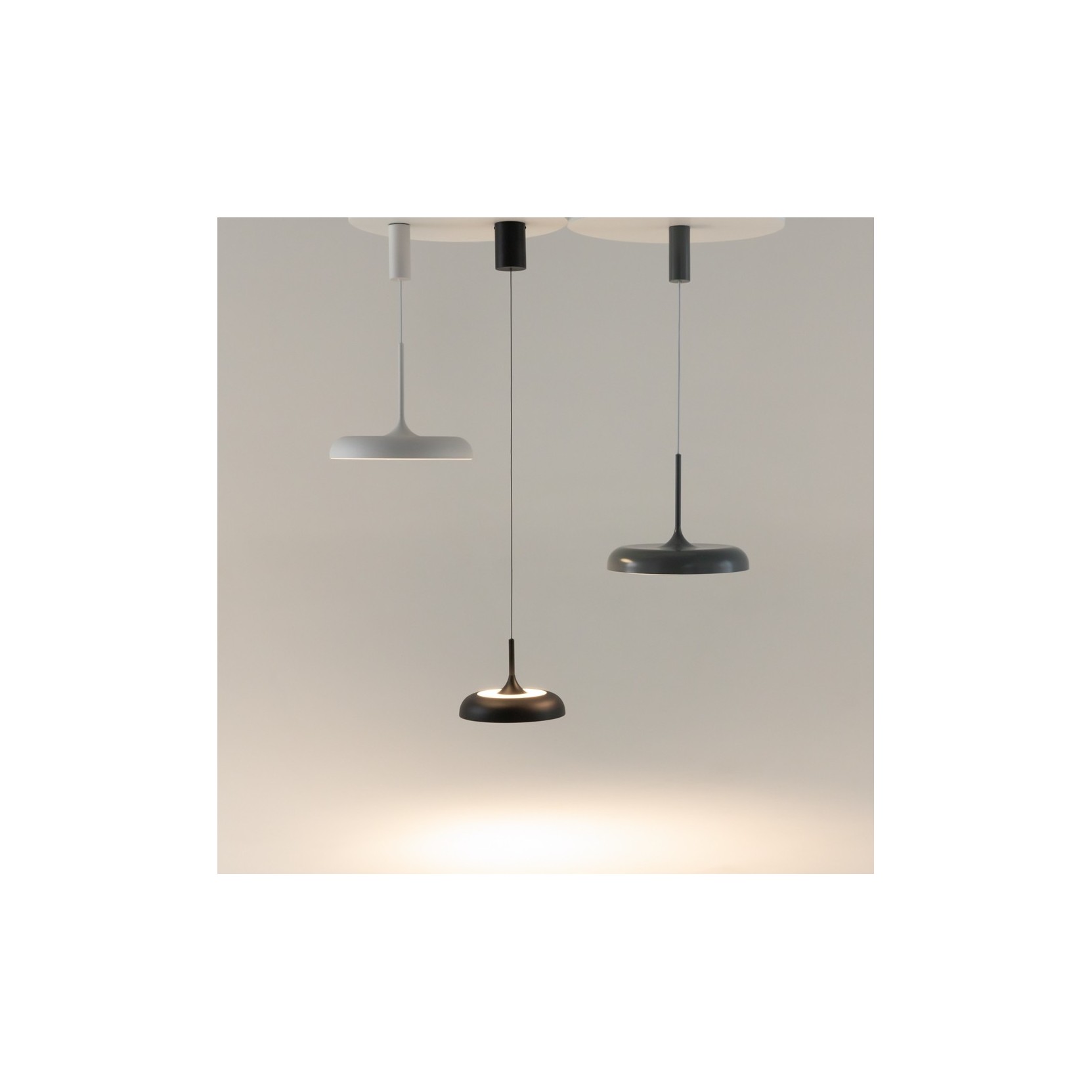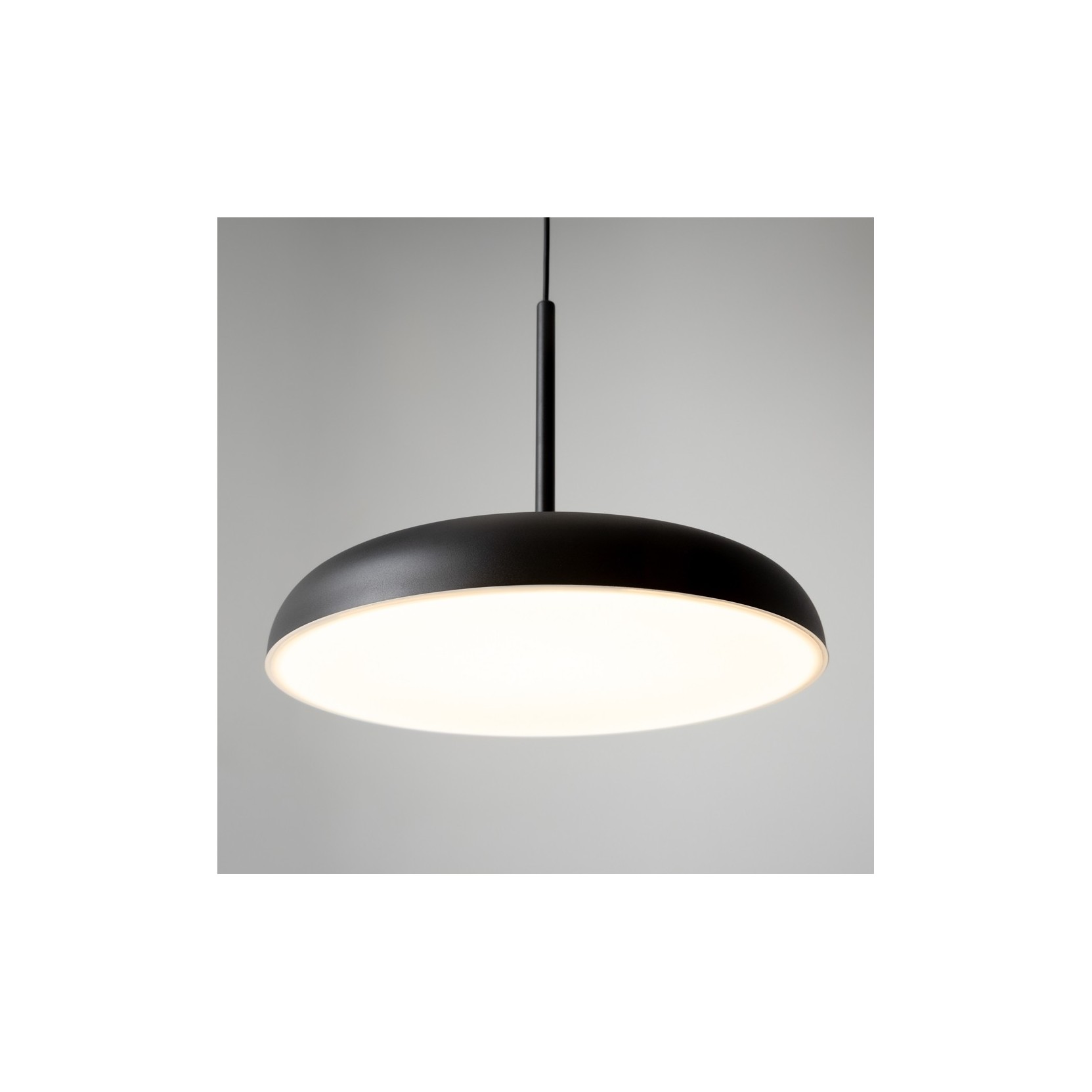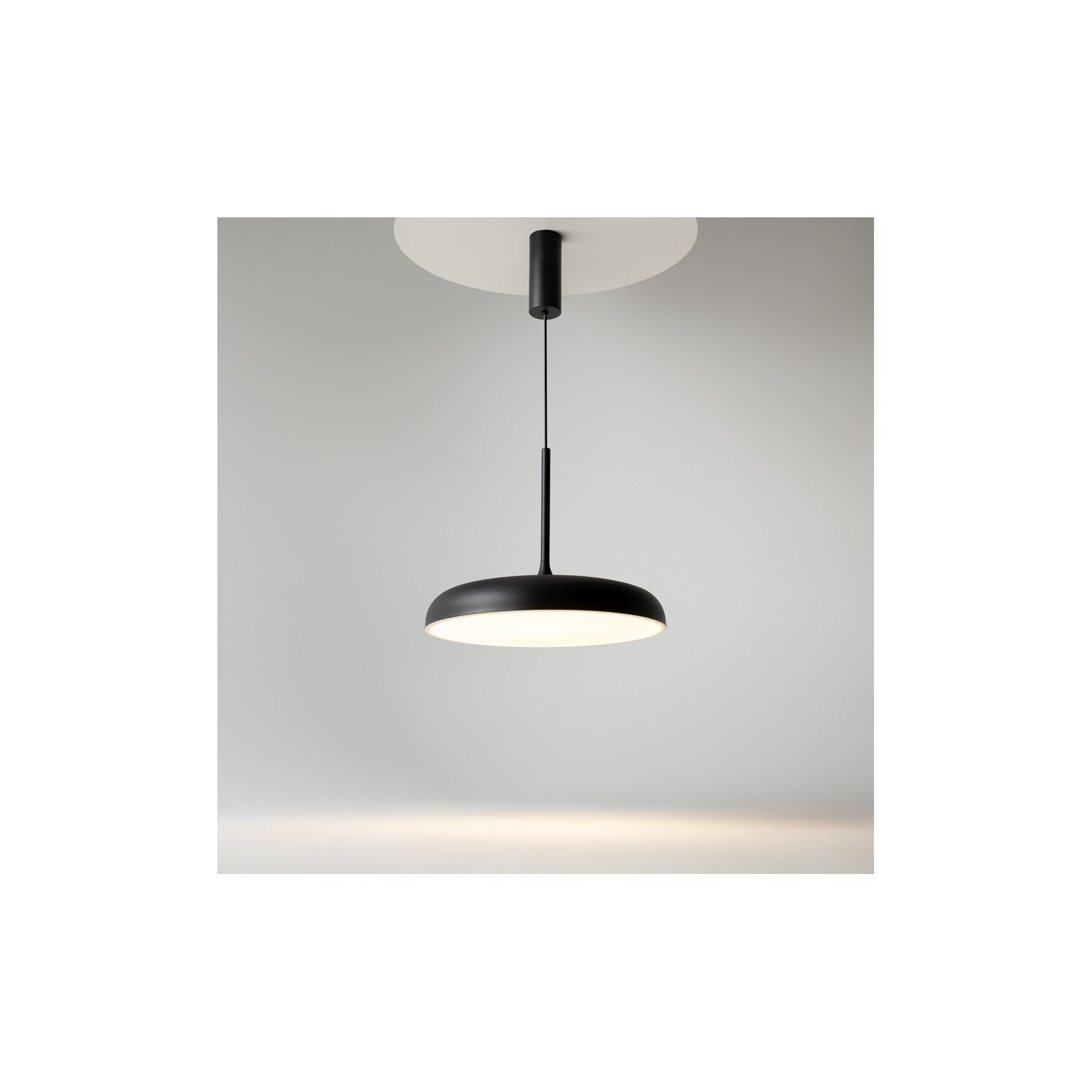 La sospensione Gerhard si distingue per la sua silhouette pulita e il profilo ultra-sottile. Caratterizzata da un diffusore a cupola ribassata in metallo nero opaco, questa lampada è progettata per proiettare una luce morbida e perfettamente omogenea verso il basso. La sua estetica "minimal-chic" la rende un elemento versatile, capace di valorizzare sia una cucina hi-tech che uno studio professionale o una zona dining dal gusto scandinavo.