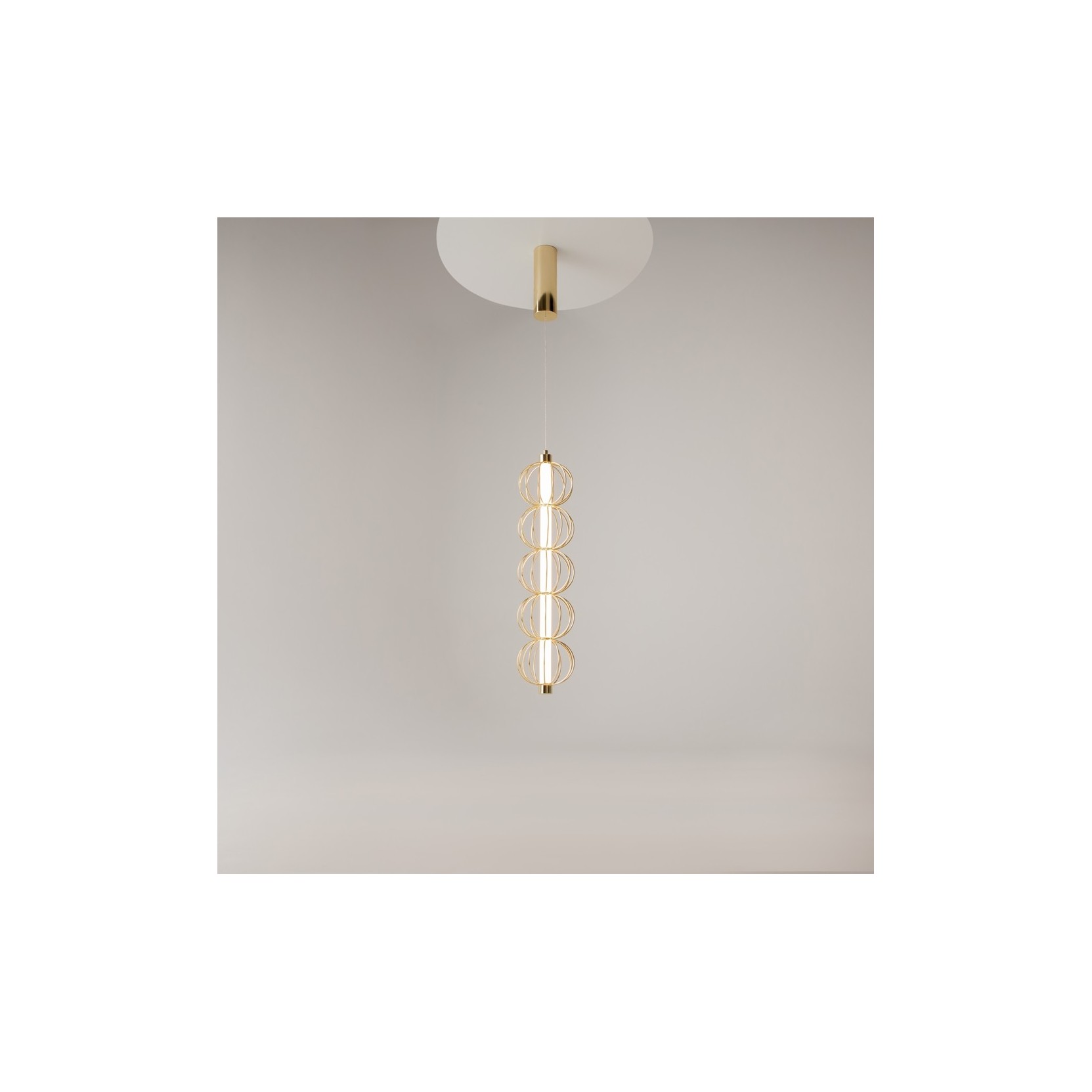 La lampada Golden Cage si distingue per una composizione asimmetrica e scultorea. Una sottile asta nera sostiene un disco bianco e una sorgente luminosa cilindrica, posizionati in un equilibrio apparentemente precario che cattura immediatamente l'attenzione. La struttura è sormontata da un ampio disco superiore che funge da calotta riflettente, creando un sofisticato gioco di proporzioni e ombre.
