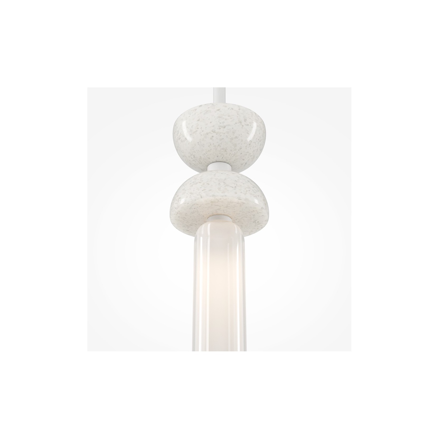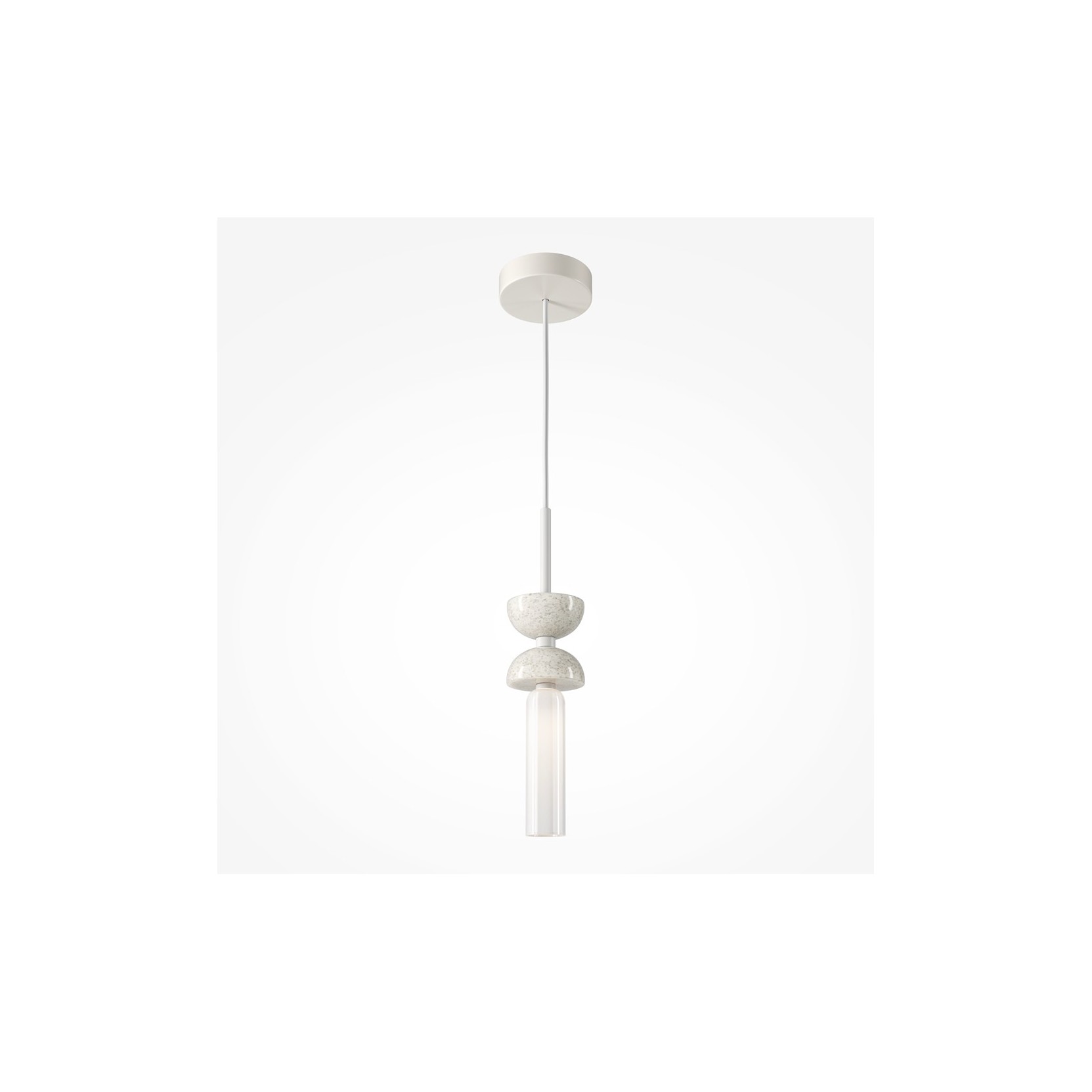La lampada kyoto ridefinisce il concetto di illuminazione puntuale attraverso un raffinato gioco di volumi sovrapposti. La struttura è caratterizzata da una parte superiore composta da due cupole contrapposte, che fungono da fulcro visivo e materico del design. Al di sotto di queste, si innesta un diffusore cilindrico in vetro opalino bianco, che emette una luce calda e perfettamente diffusa.