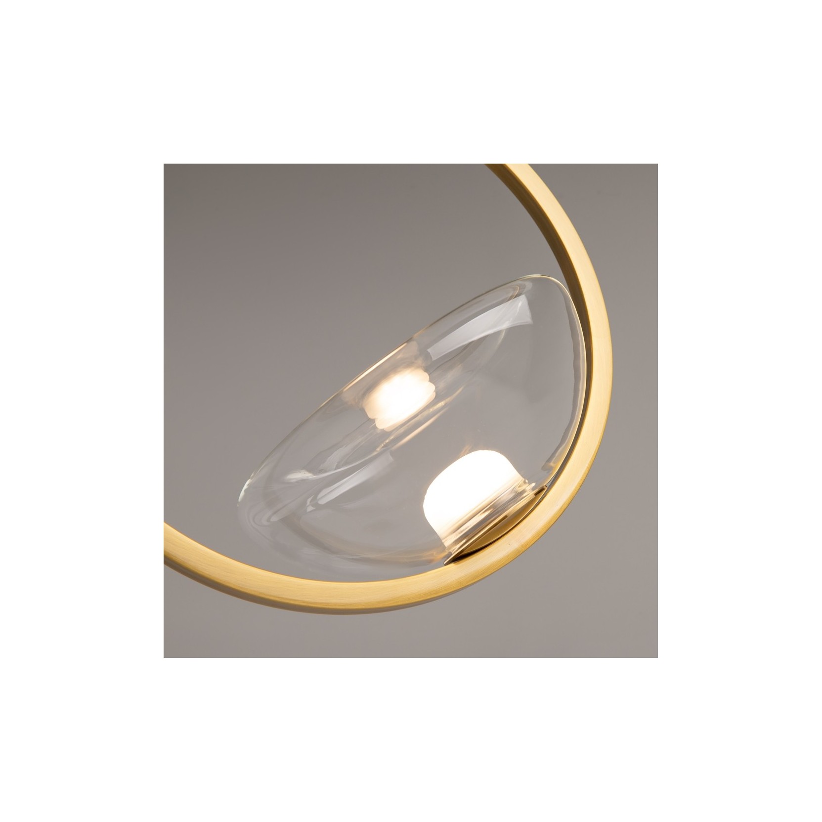 La lampada Lunare si distingue per la sua struttura scultorea e asimmetrica. Caratterizzata da un sottile stelo centrale in finitura oro satinato, la lampada sostiene un'asta orizzontale che sembra galleggiare nel vuoto. Ad un'estremità troviamo un cerchio luminoso perfetto (un anello LED), mentre l'asta prosegue verso il lato opposto creando un senso di estensione infinita. Questa composizione sfida le leggi della statica, trasformando un corpo illuminante in una vera installazione d'arte moderna.