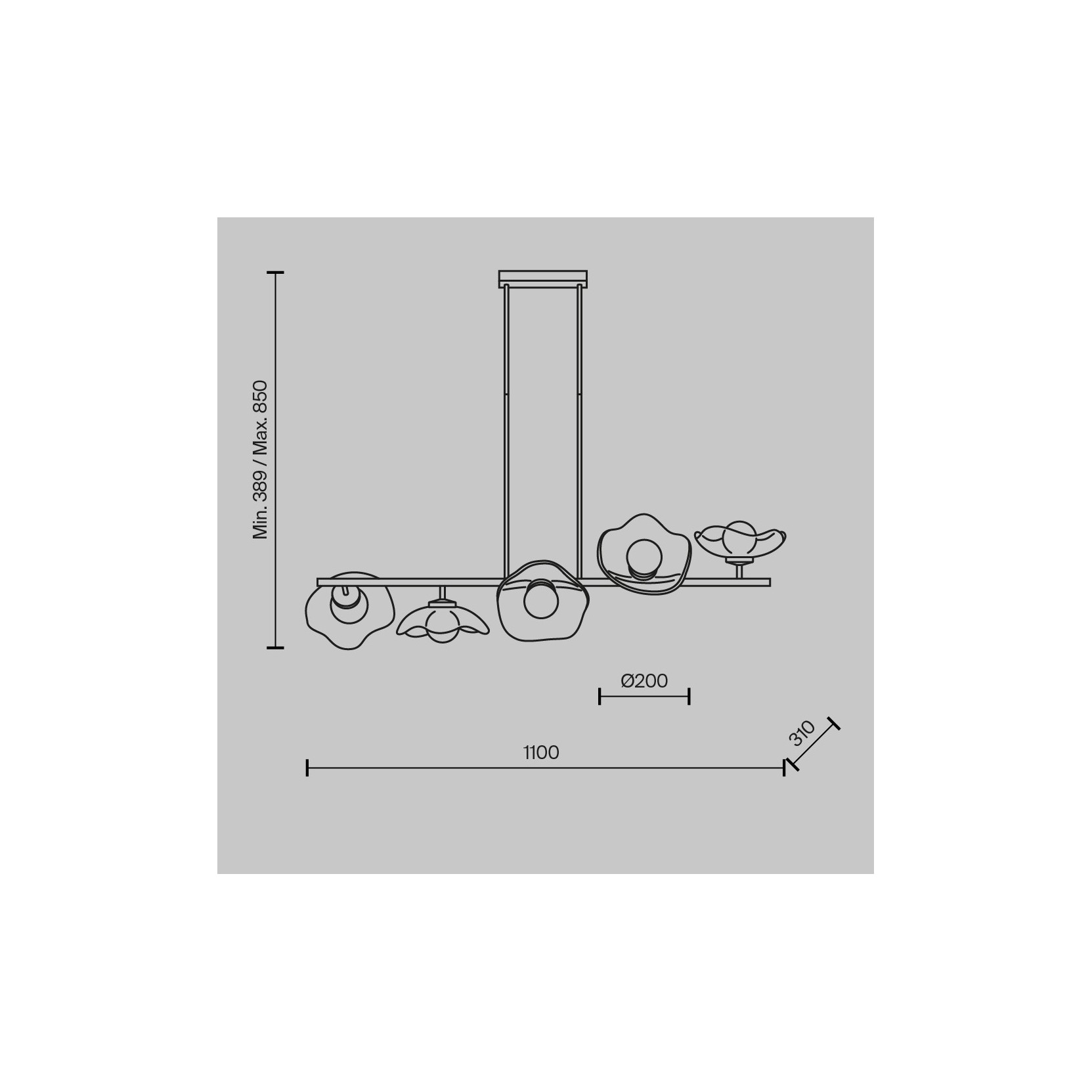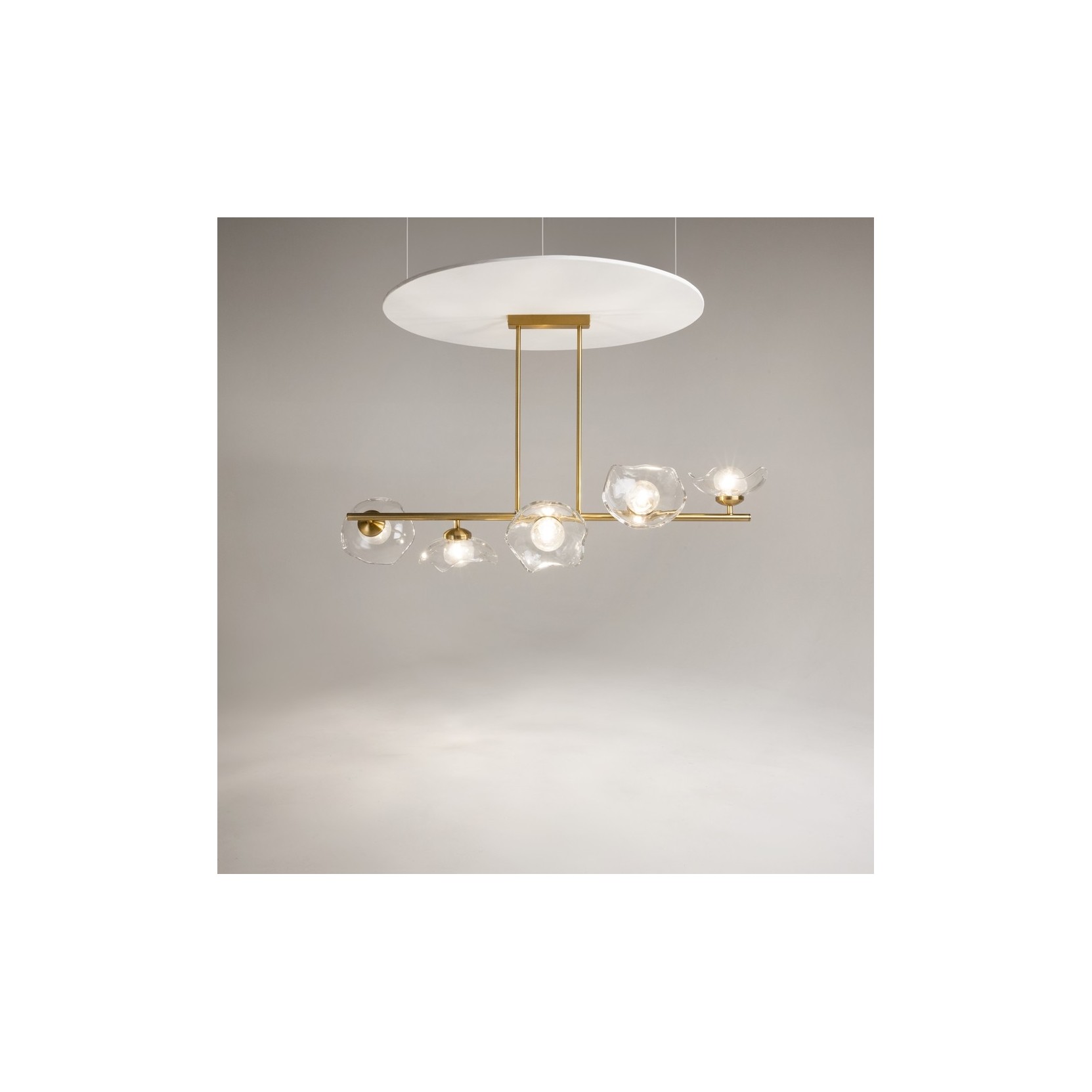La lampada miracle si distingue per una struttura orizzontale a bilanciere in oro satinato, sorretta da due sottili steli verticali che partono da un rosone circolare minimalista. Lungo l'asta principale sono incastonati cinque diffusori in vetro trasparente dalla forma organica, che ricordano petali di fiori o bolle di sapone appena formate. Ogni diffusore è unico nella sua irregolarità, creando un effetto di movimento e naturalezza che rompe la rigidità delle linee metalliche.