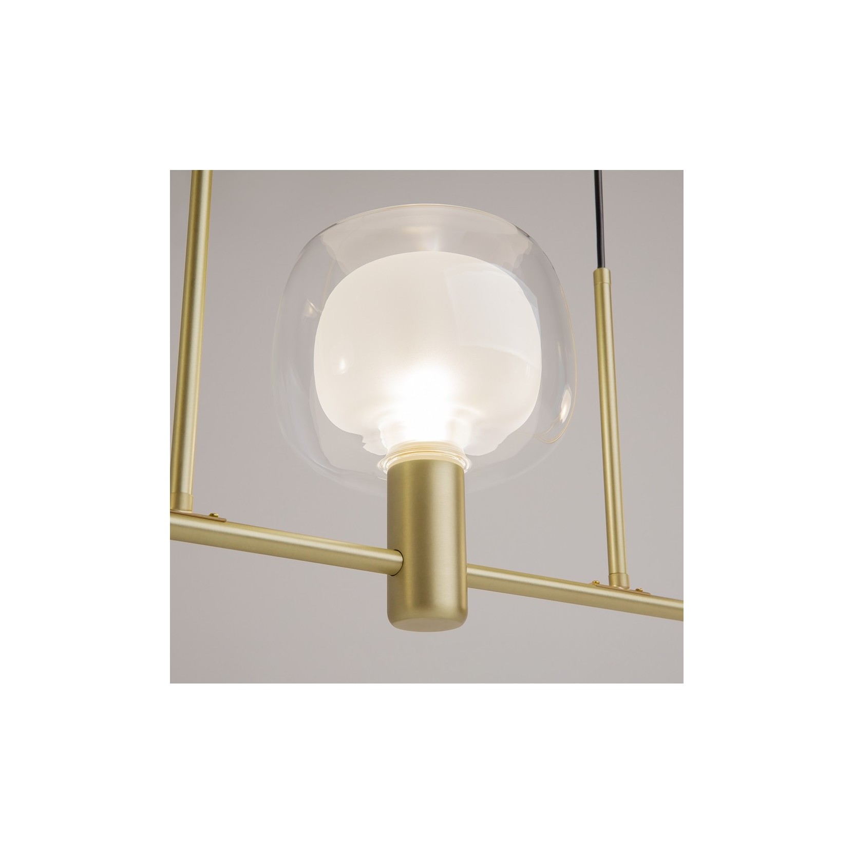 La lampada a sospensione vision è un sistema d'illuminazione lineare che combina l'eleganza dell'oro satinato con la leggerezza del vetro soffiato. Il suo design orizzontale la rende un elemento perfetto per definire spazi conviviali o di lavoro con un tocco di modernità sofisticata.