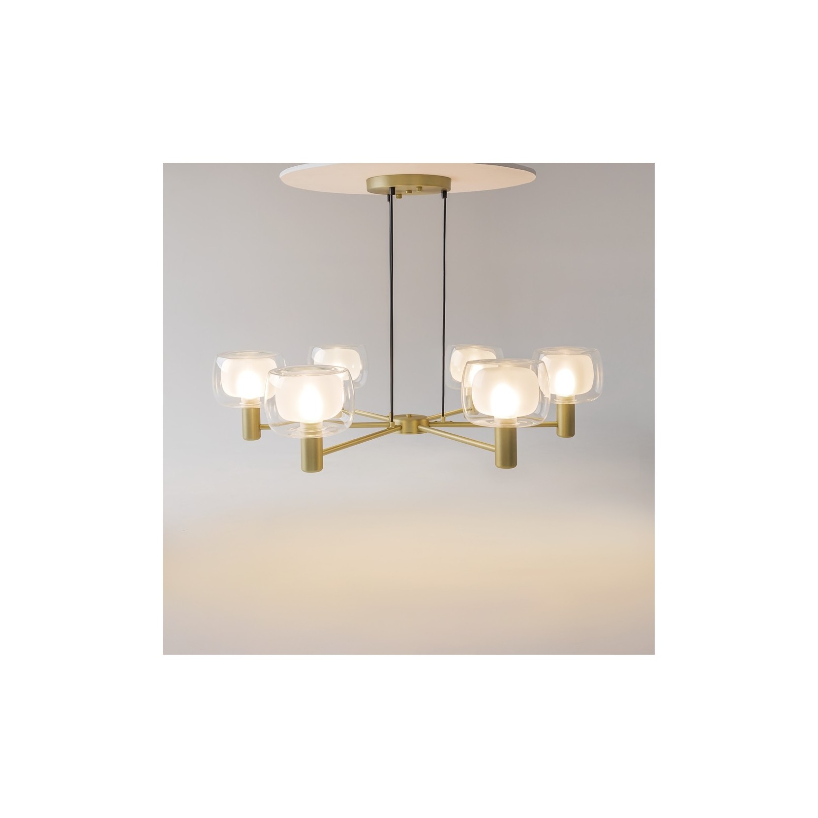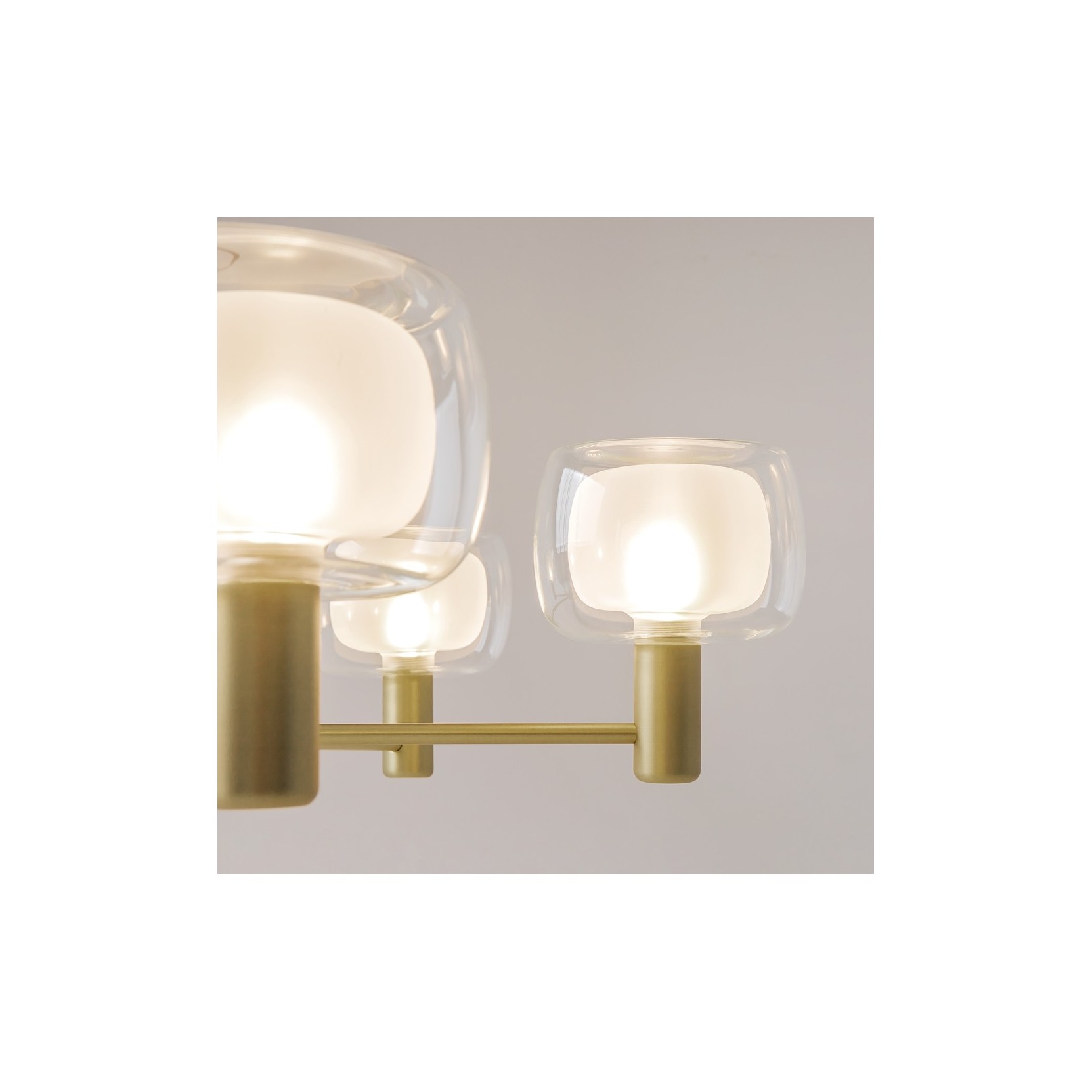 La lampada a sospensione vision è un sistema d'illuminazione lineare che combina l'eleganza dell'oro satinato con la leggerezza del vetro soffiato. Il suo design orizzontale la rende un elemento perfetto per definire spazi conviviali o di lavoro con un tocco di modernità sofisticata.