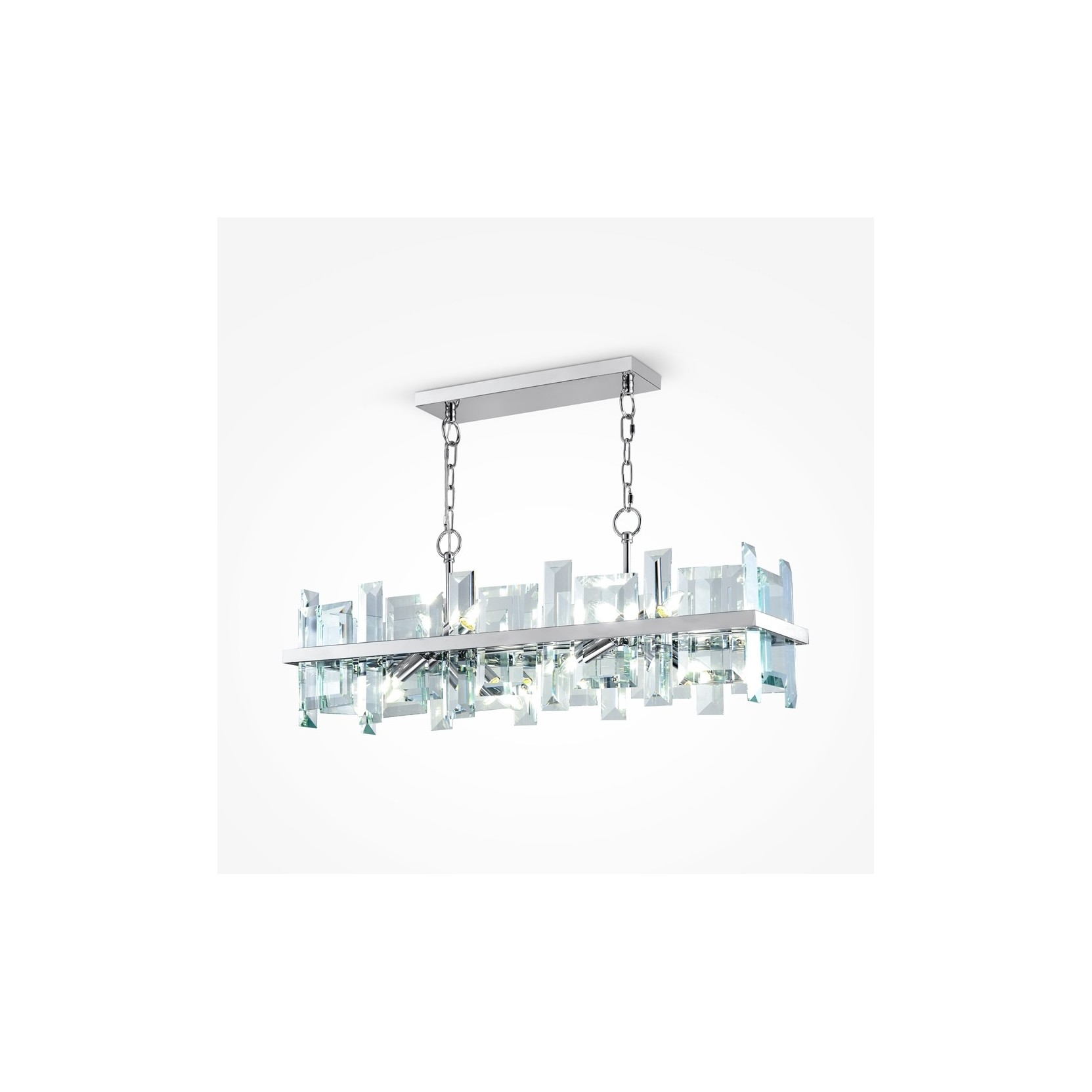 La lampada a sospensione Cerezo è un elemento d'illuminazione di lusso che combina un'estetica architettonica moderna con la preziosità classica del cristallo. Caratterizzata da uno sviluppo orizzontale e una struttura imponente, questa lampada è progettata per essere la protagonista assoluta di ambienti sofisticati, creando un gioco di rifrazioni unico.