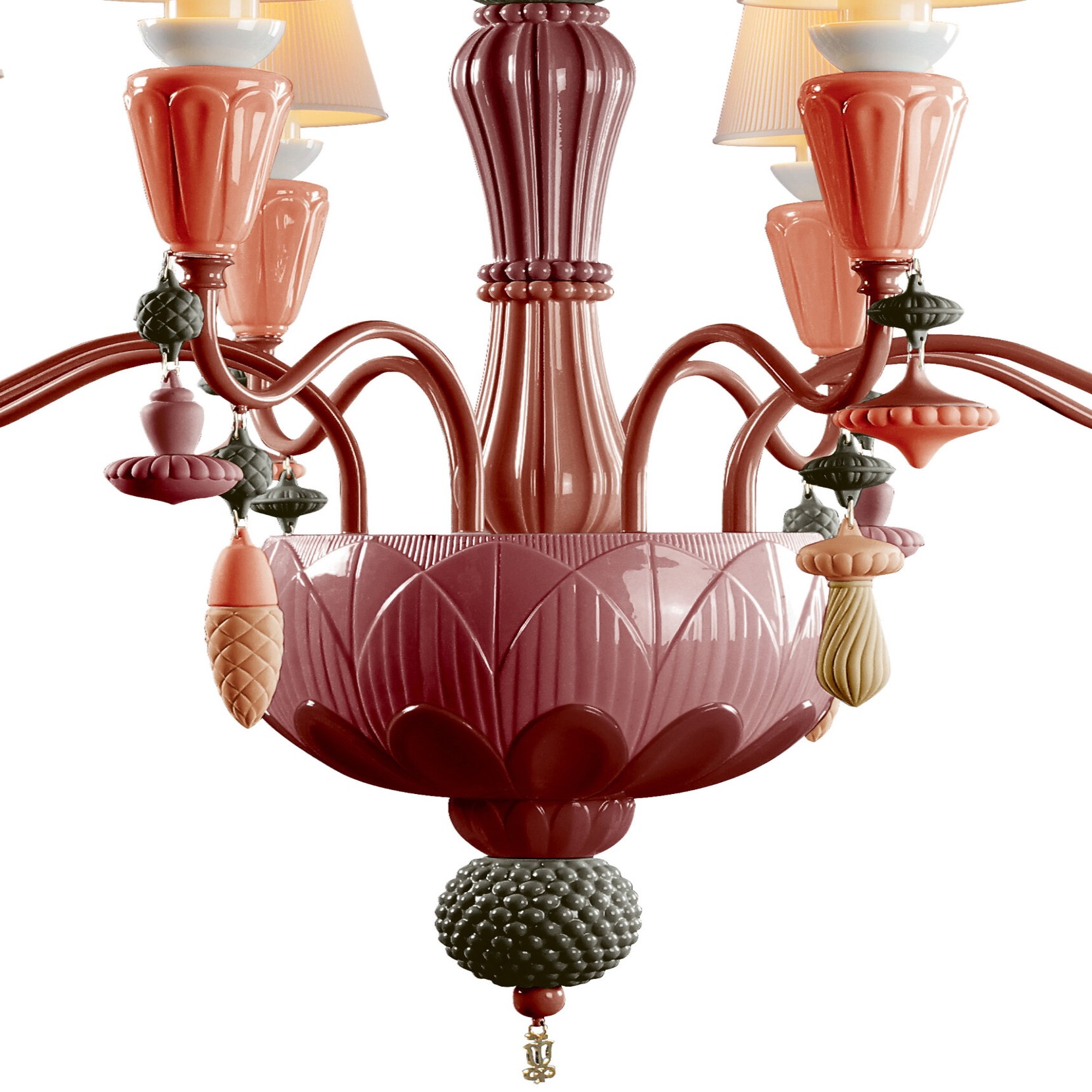 Lampadario a otto luci ispirato a motivi vegetali, interpretato da linee arrotondate, organiche e geometriche. Nel design della collezione predominano le forme sintetiche, femminili, tornite, senza spigoli, in porcellana. Gli accessori sospesi fanno riferimento a semi e bulbi; le basi delle luci e altre parti del fusto fanno riferimento a foglie e petali di fiori sul punto di apertura; i lithophanes si ispirano alle forme dei funghi forestali. La palette di colori del Corallo Rosso si ispira alla bellezza delle sue specie rare e delicate e al suo colore ineguagliabile.