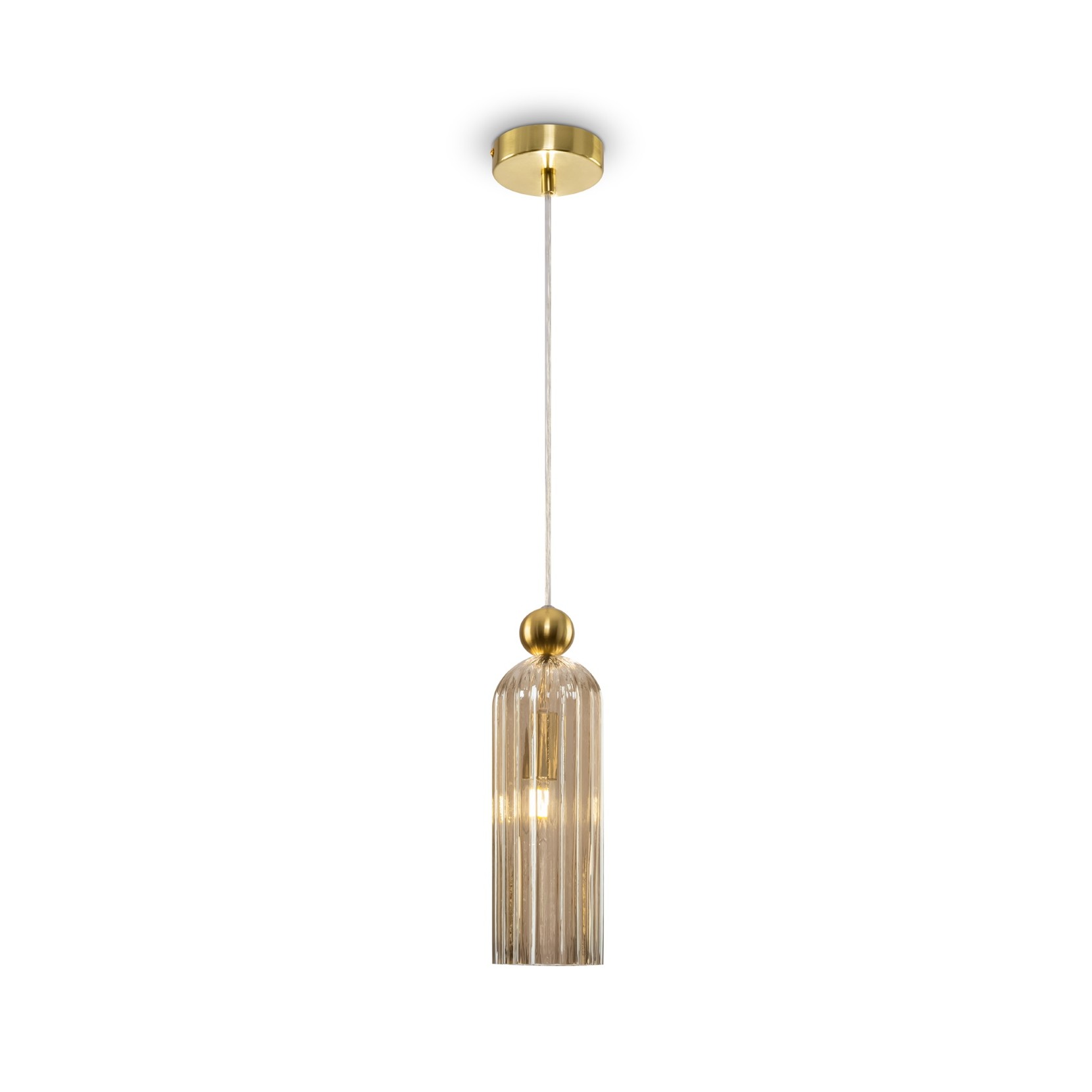 Maytoni propone la lampada a sospensione Antic composta da una struttura in metallo dorato e paralume in vetro rigato dalla forma cilindrica,
