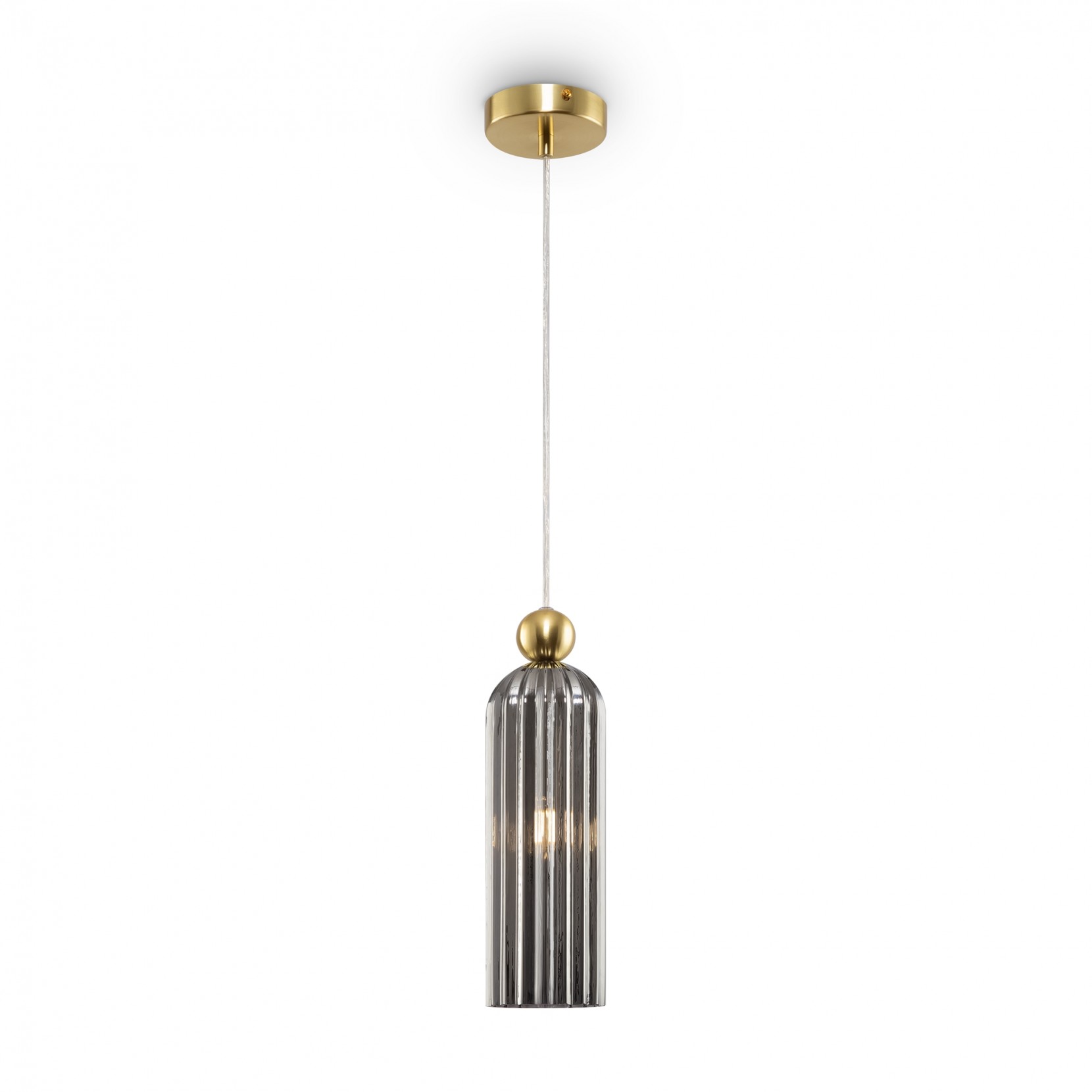 Maytoni propone la lampada a sospensione Antic composta da una struttura in metallo dorato e paralume in vetro rigato dalla forma cilindrica,