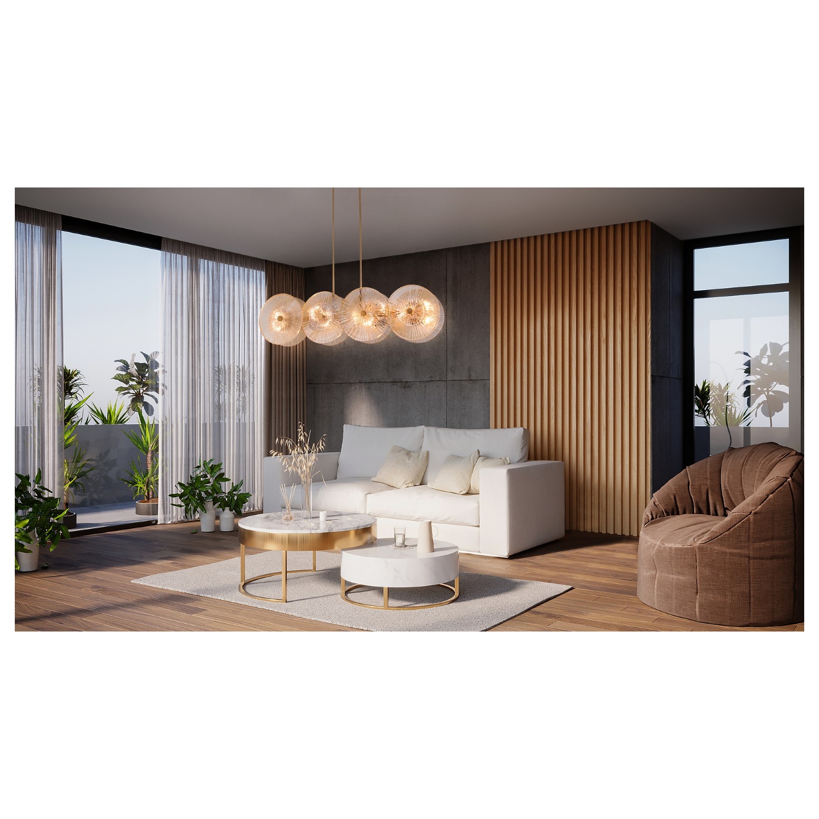 Maytoni ha progettato la lampada a sospensione Aster, la struttura in metallo dalla tonalità color oro è bordata da cerchi in vetro stampato dalla tonalità ambrata e trasparente che si alternano. L'altezza della lampada a sospensione è regolabile.