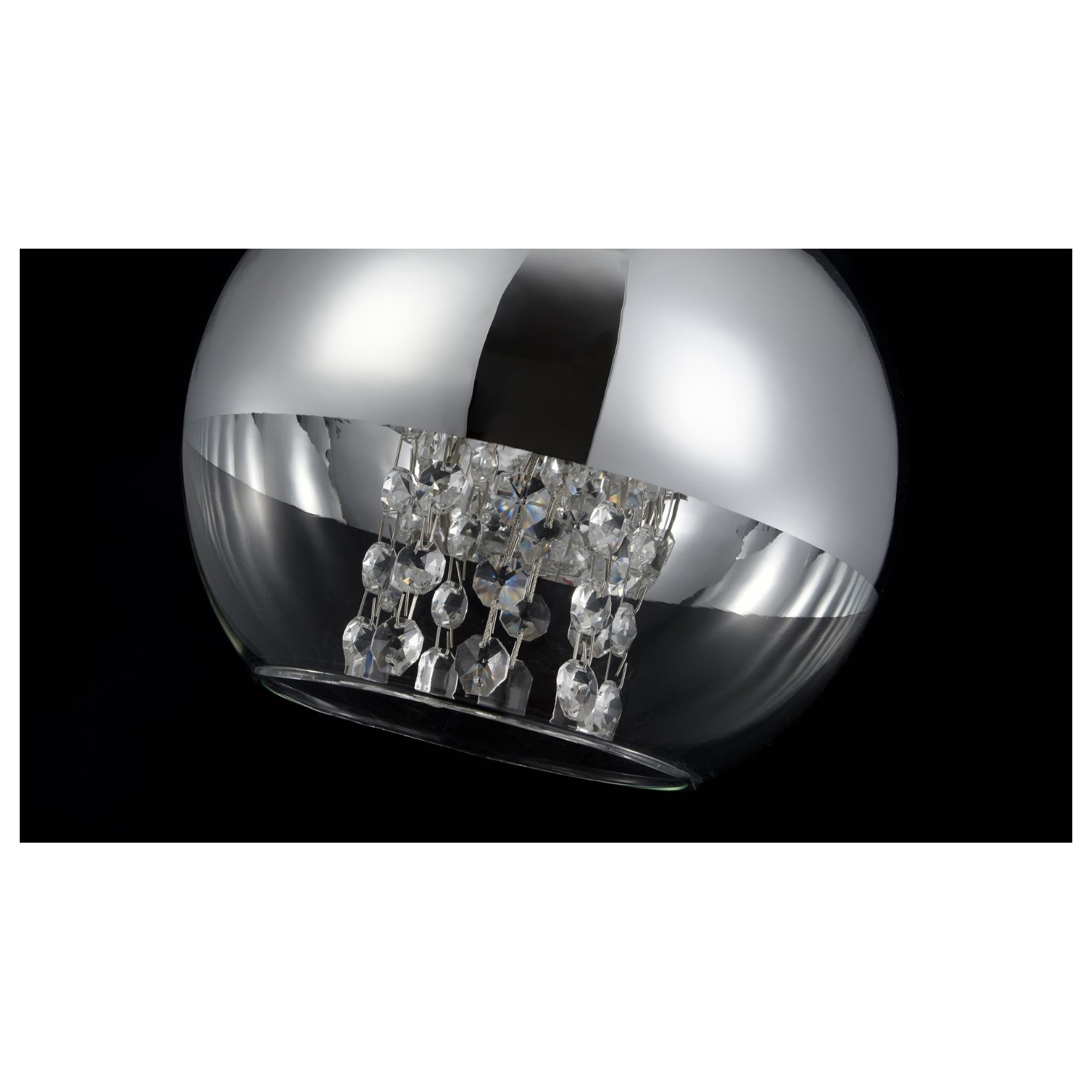 FERMI è la lampada a sospensione con struttura in metallo e diffusori oro o cromo, il paralume in vetro con cristalli decorativi