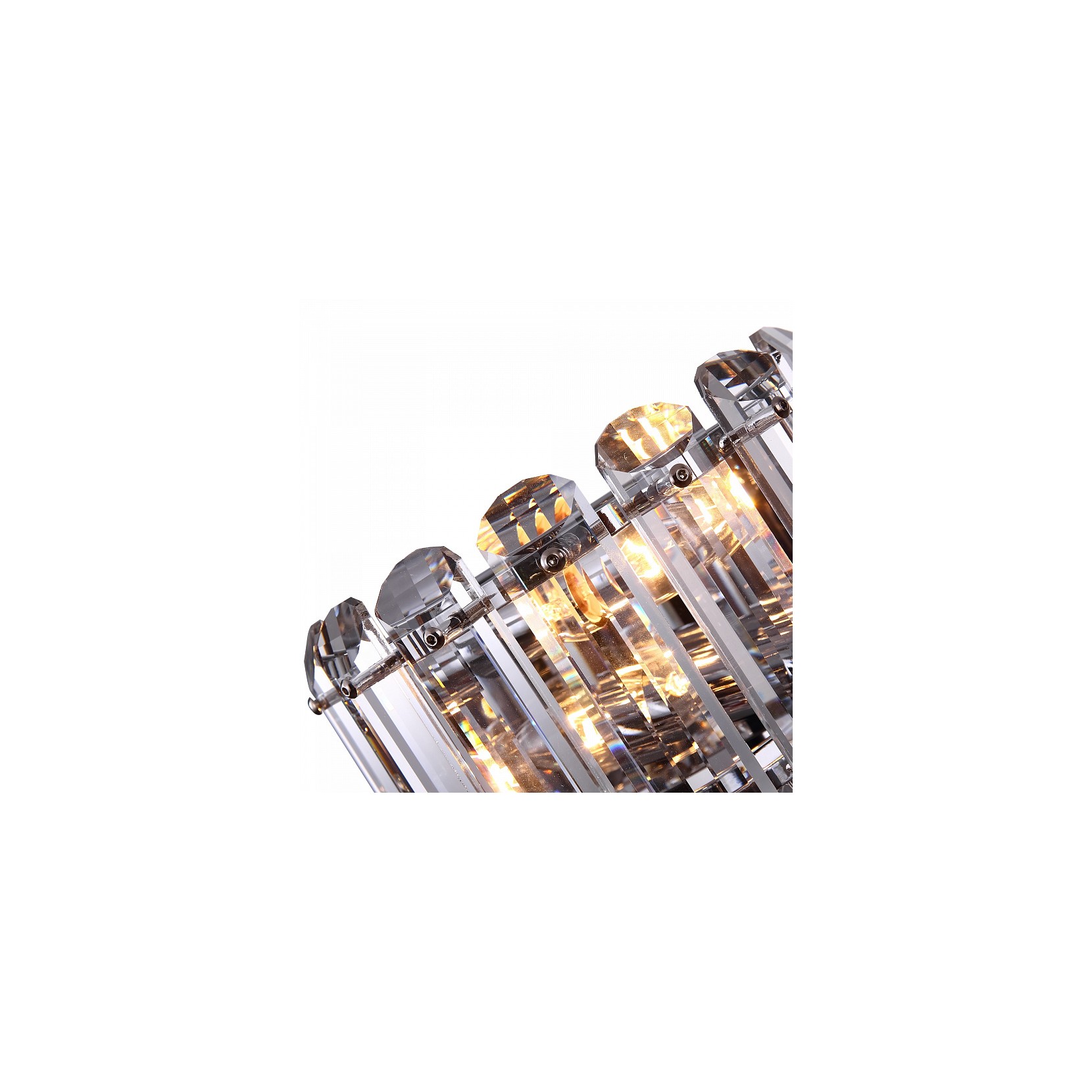 La lampada da parete HAIL con struttura in metallo cromata e nella finitura cromo. HAIL vede la combinazione di due tipologie di taglio del vetro. Un taglio bislungo grosso e un taglio sferico da gioielli pendenti. I modelli della serie sono a sospensione o nella versione a parte a 6,8,12 luci. L'altezza della lampada è regolabile.
