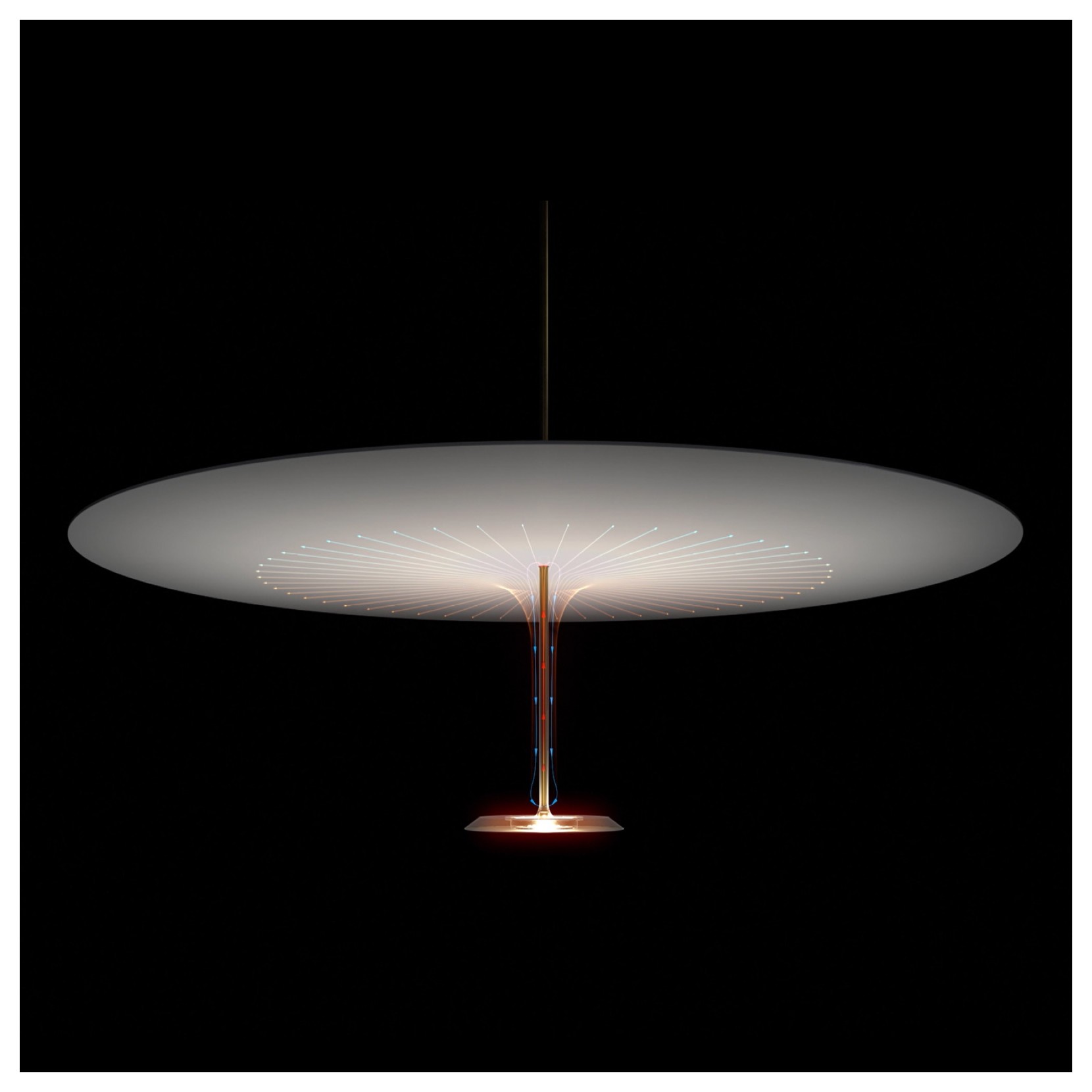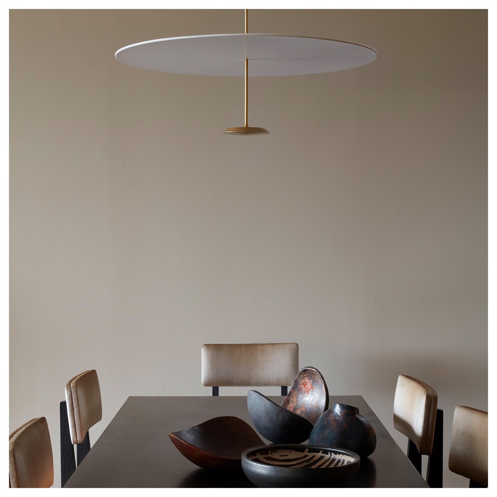 La lampada a sospensione DOT è ina lampada da design ma funzionale. La lampada è composta da due dischi in alluminio paralleli di dimensioni diverse, dove il disco più piccolo contiene un anello di LED. DOT è disponibile in tre diametri differenti: ø110cm (55W), ø80cm (41W), ø60cm (23W). Inoltre le finiture sono due: ottone anodizzato e nero anodizzato.