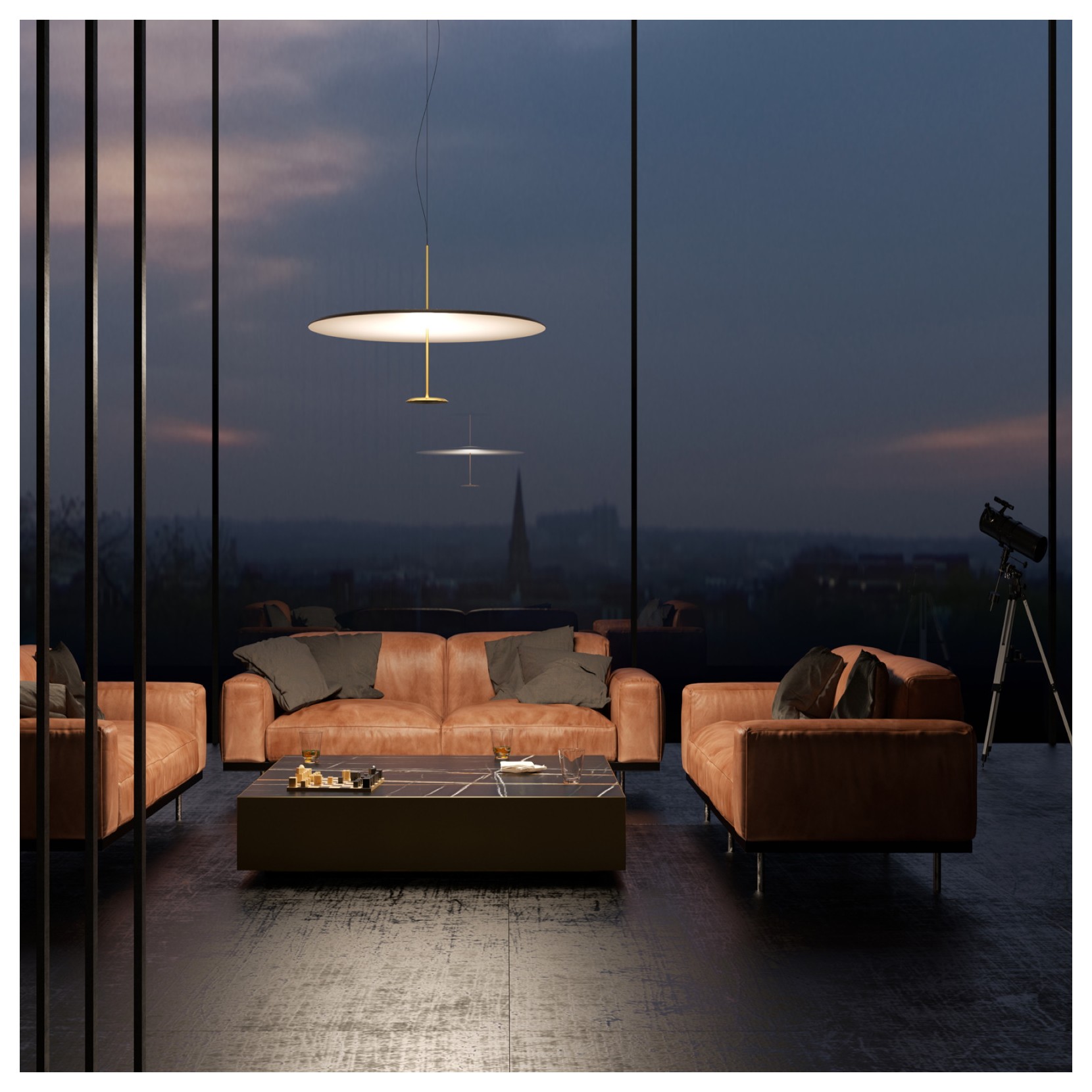 La lampada a sospensione DOT è ina lampada da design ma funzionale. La lampada è composta da due dischi in alluminio paralleli di dimensioni diverse, dove il disco più piccolo contiene un anello di LED. DOT è disponibile in tre diametri differenti: ø110cm (55W), ø80cm (41W), ø60cm (23W). Inoltre le finiture sono due: ottone anodizzato e nero anodizzato.