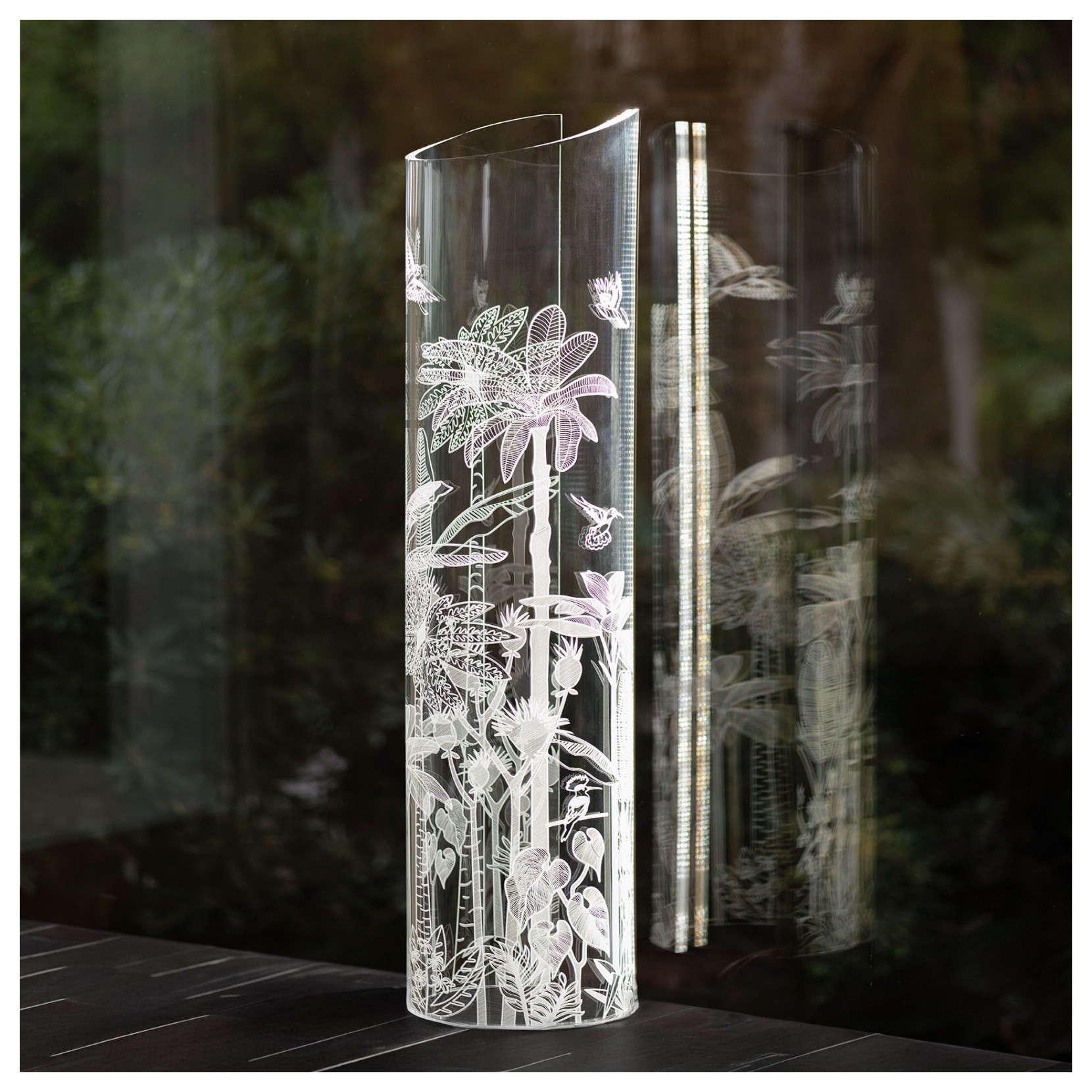 Wave è una lampada da tavolo di design, realizzata con un'unica lastra di cristallo acrilico piegata a mano, con foglie di materiali preziosi incorporate.