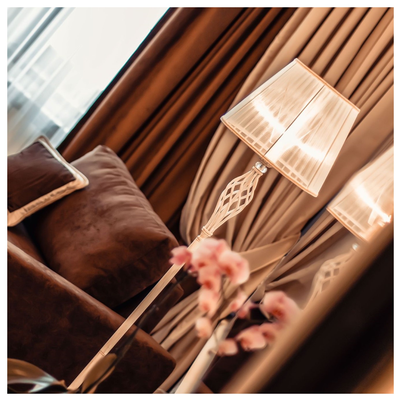La lampada da terra Grace si compone di una struttura in metallo bianco e oro. La particolare struttura si compone di un paralume in organza bianca plissettati con elementi decorativi in cristallo.