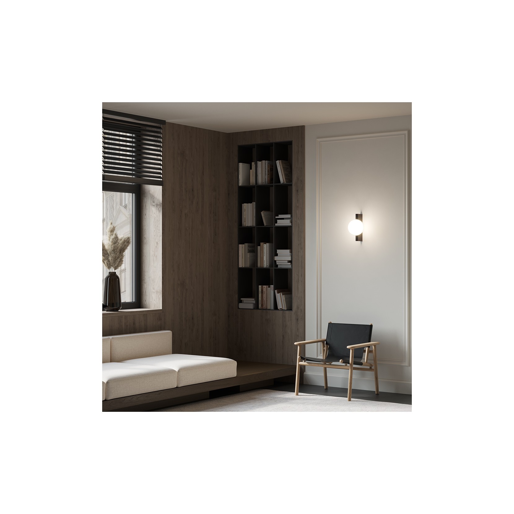 L'armatura in metallo si distingue per la sua robustezza, dando un tocco di eleganza e forza alla composizione. Le plafoniere, con finiture in nero opaco, ottone e cromo, creano un gioco di riflessi che varia con la luce, arricchendo l’ambiente con un'atmosfera sofisticata. La plafoniera-sfera, con il suo vetro bianco e il design essenziale, diffonde una luce morbida e uniforme. I ganci nascosti conferiscono un aspetto pulito e minimalista, mentre la geometria originale nel design rende l'insieme unico, con linee decise e moderne che si integrano armoniosamente nell'ambiente. Il disegno d'ombra è elegante e discreto, creando giochi di luce che arricchiscono ogni angolo con raffinatezza.