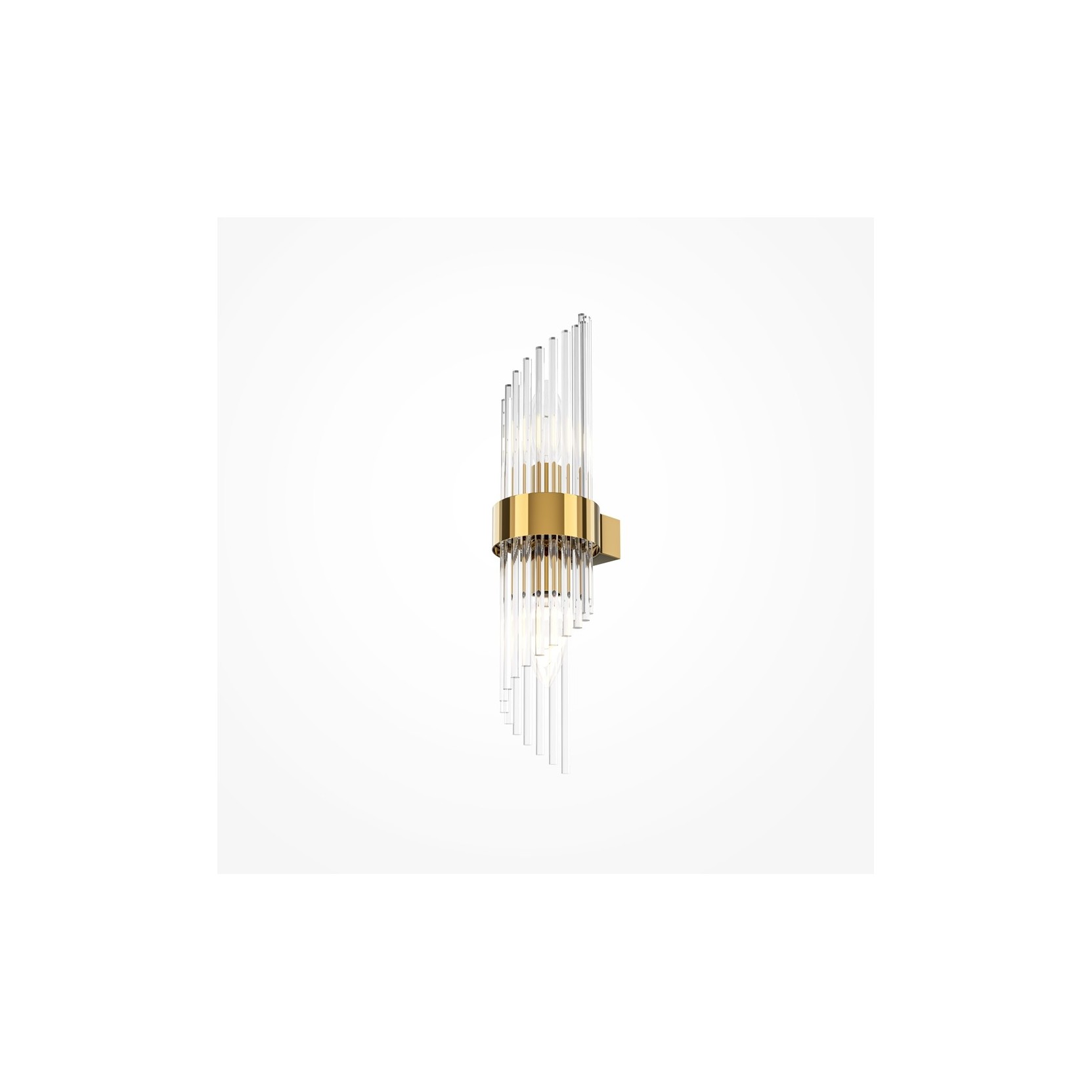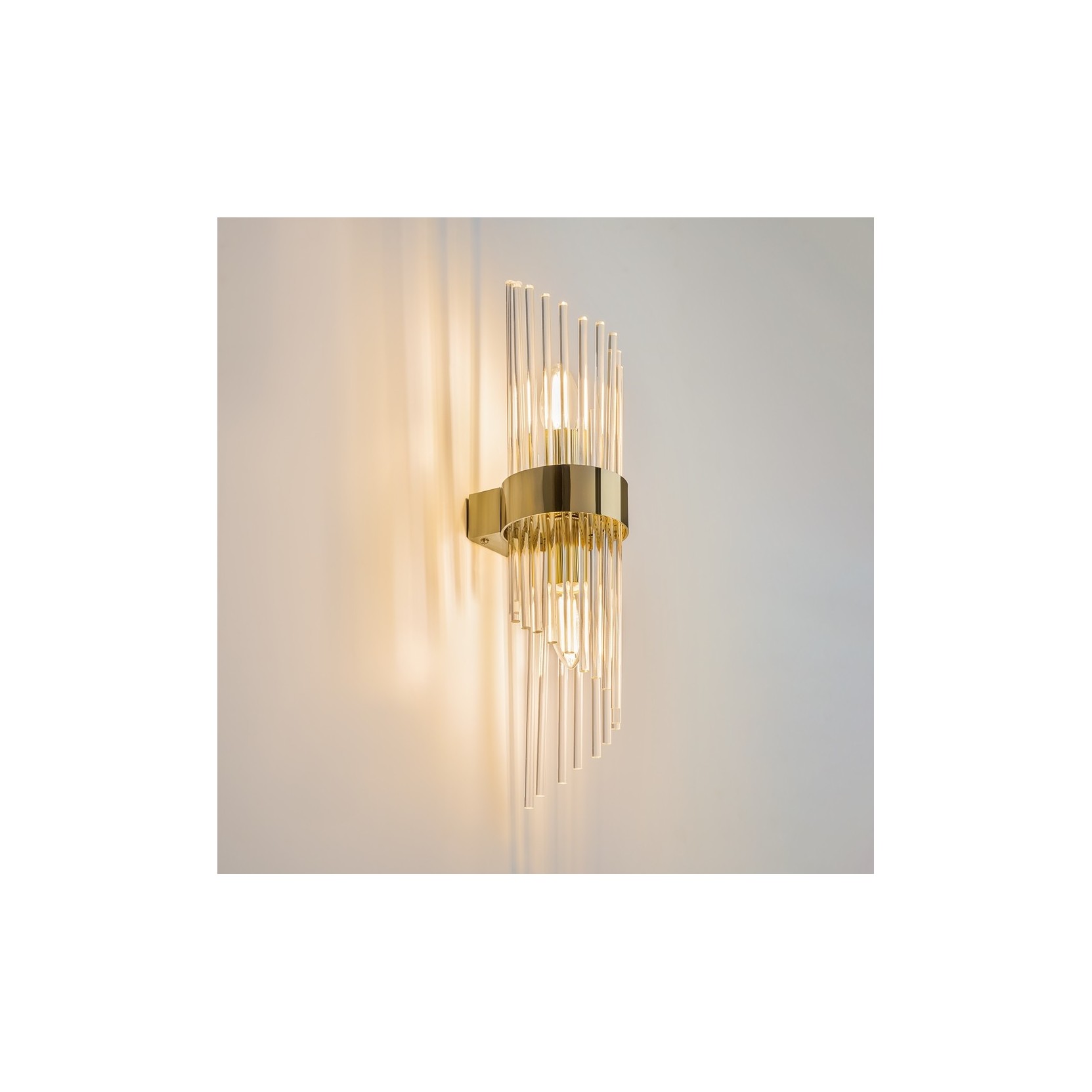 L'applique Frame si distingue per la sua struttura scultorea, pensata per trasformare una semplice parete in una superficie scenografica. Il cuore del design è una fascia centrale in oro lucido che abbraccia una fitta sequenza di tubi in vetro cannettato trasparente di diverse altezze. La disposizione asimmetrica degli elementi in vetro crea un profilo a gradoni che evoca le canne di un organo, conferendo ritmo e dinamismo visivo a tutto l'ambiente.