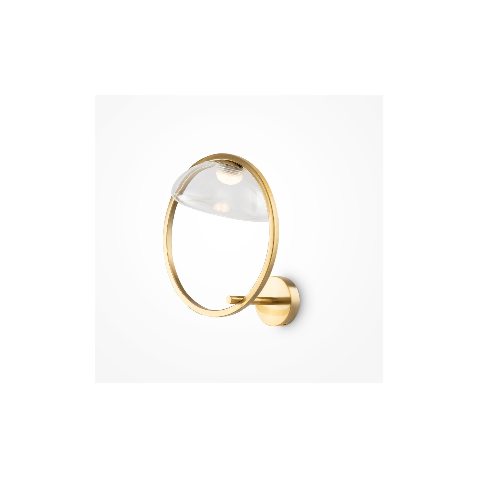 L'applique Lunare si distingue per la sua struttura circolare in metallo con una preziosa finitura oro satinato, che funge da orbita per un diffusore in vetro trasparente a forma di bolla. Questa composizione crea un dinamismo visivo unico: la sfera di luce sembra galleggiare o scivolare lungo il profilo metallico, sfidando la staticità delle lampade tradizionali e trasformando la parete in un palcoscenico di riflessi caldi e accoglienti.
