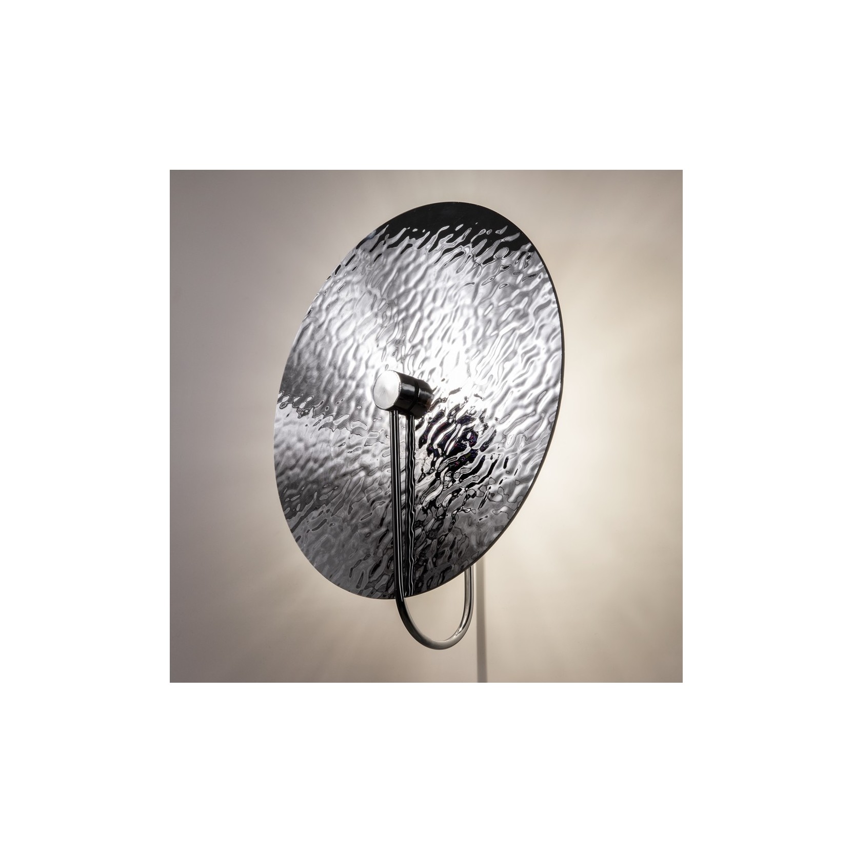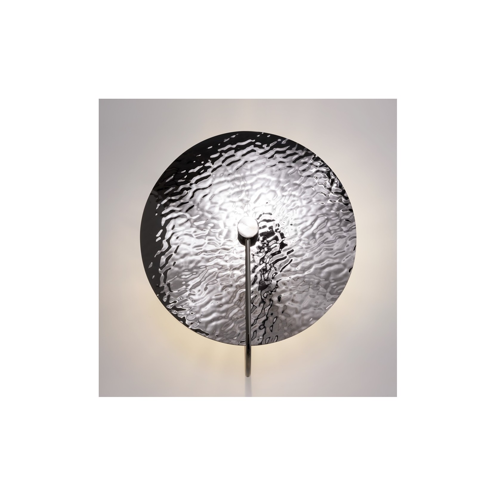 L'applique mare si distingue per il suo grande diffusore circolare in metallo cromato, la cui superficie è sapientemente lavorata per emulare le increspature dell'acqua. Questa texture "viva" interagisce costantemente con la luce e l'ambiente circostante, creando riflessi dinamici e giochi di profondità che cambiano a seconda dell'angolazione da cui la si osserva. Al centro, un'asta sottile e minimale sostiene il corpo illuminante, mantenendo una pulizia formale assoluta.