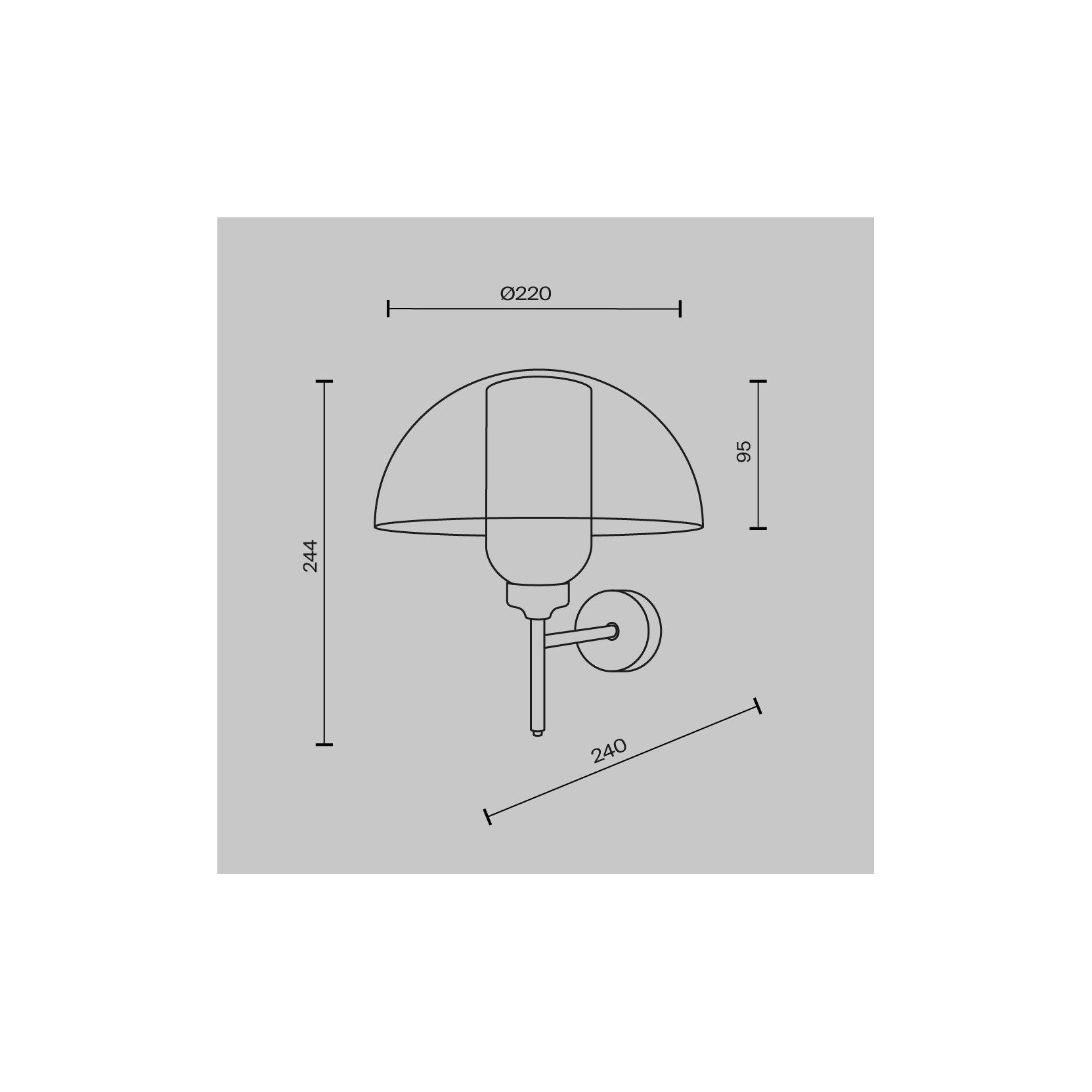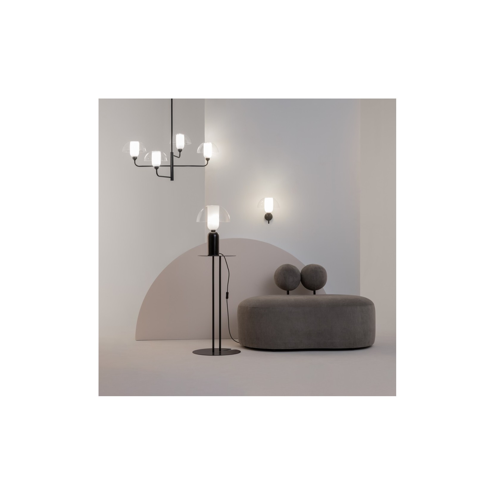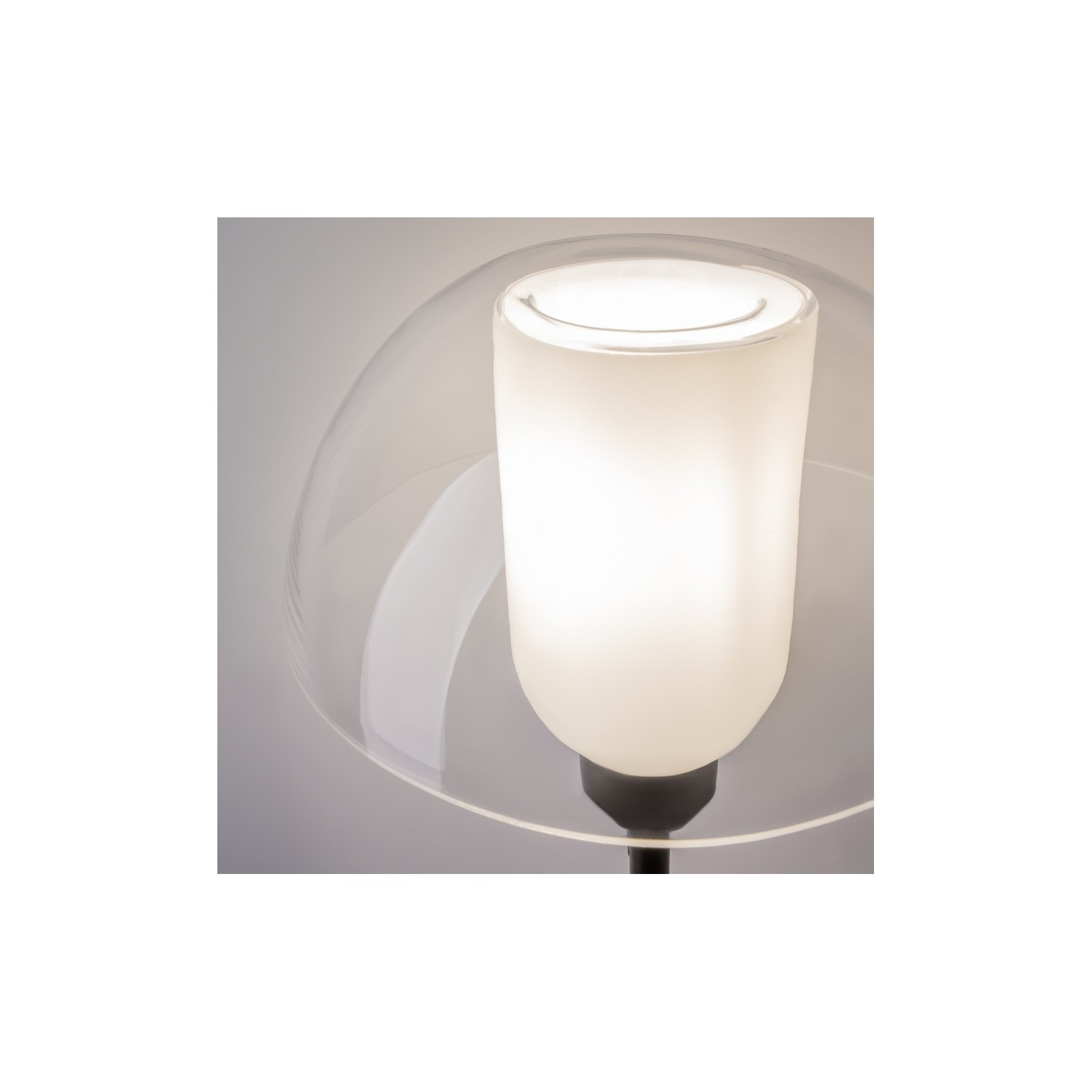 L'applique si distingue per una composizione basata sulla sovrapposizione di volumi puri. La struttura è caratterizzata da un supporto a parete circolare dal quale si protende un braccio a "L" in metallo nero opaco. Il cuore della lampada è il diffusore: un cilindro in vetro opalino bianco che scherma la luce, sormontato da una calotta semisferica in vetro trasparente. Questo gioco di "bolla nella bolla" crea una profondità visiva affascinante, dove la luce sembra protetta da un guscio cristallino.