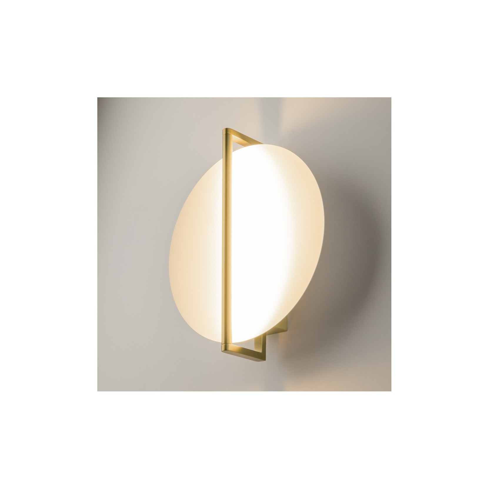 La lampada mira si distingue per il suo design essenziale e rigoroso, composto da un grande disco diffondente in vetro opalino satinato attraversato verticalmente da un sottile profilo in metallo brunito. Questa "asse" metallica non solo funge da supporto strutturale, ma taglia visivamente il cerchio di luce, creando un equilibrio perfetto tra pieno e vuoto, luce e ombra. L'effetto finale richiama le fasi astronomiche, portando un tocco di poesia razionalista sulla parete.