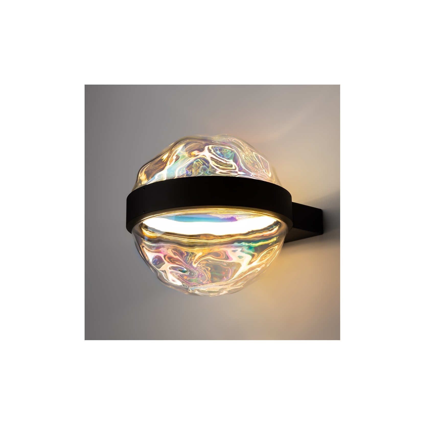 La lampada è composta da una sfera cava in vetro dalla texture organica e increspata, che ricorda la superficie dell'acqua in movimento o formazioni nebulose cosmiche. La sfera è attraversata verticalmente da un anello metallico in nero satinato che ospita la sorgente LED integrata, proiettando la luce verso l'interno del vetro per enfatizzarne ogni singola sfaccettatura e iridescenza.