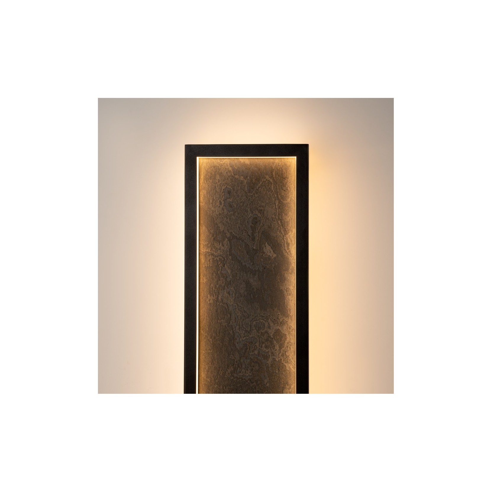 Eleva l'atmosfera dei tuoi interni con l'applique Orign, un pezzo d'arredo che ridefinisce il concetto di illuminazione decorativa. Questa lampada non è solo un punto luce, ma una vera e propria installazione artistica verticale che fonde il rigore del metallo con la bellezza ancestrale della pietra.