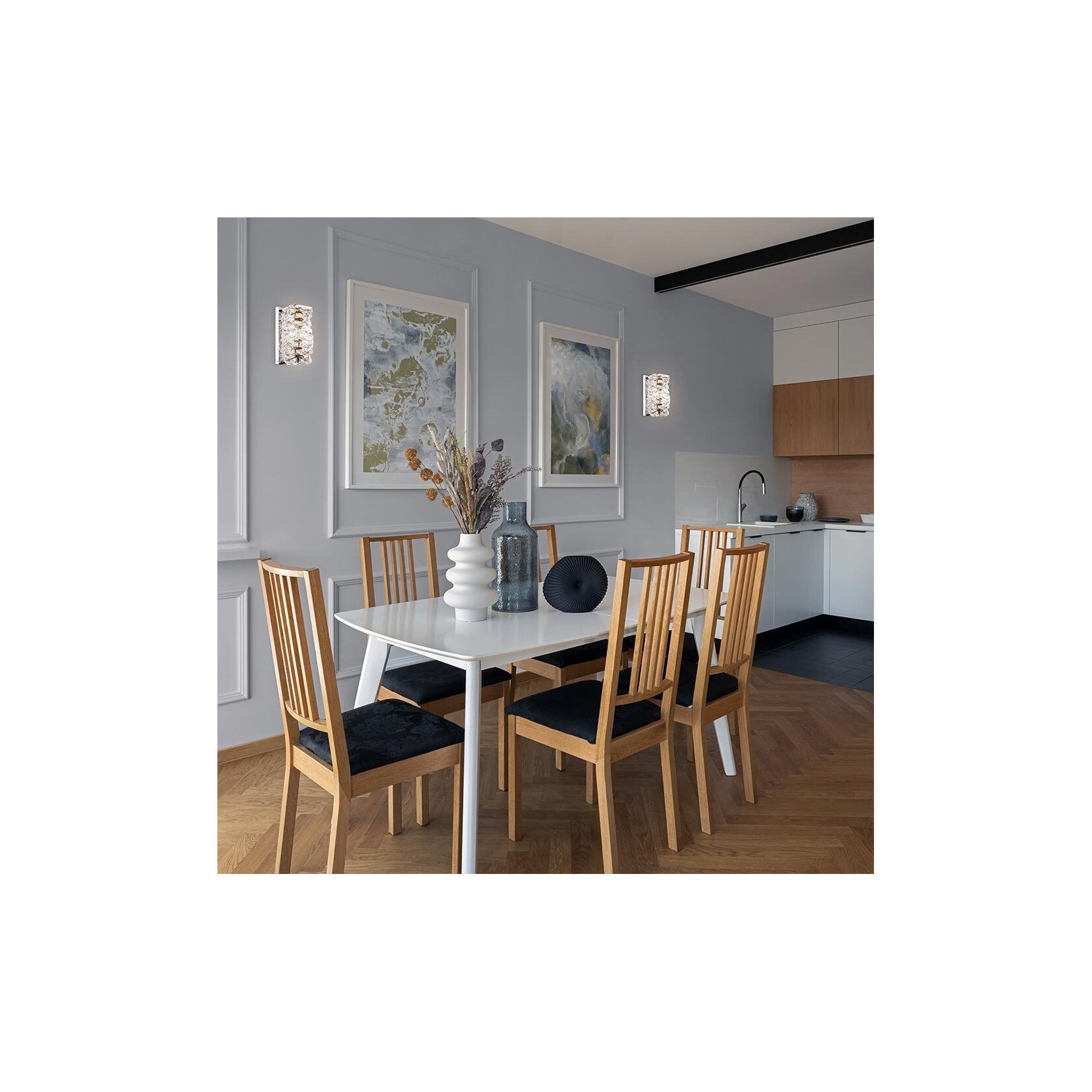 L'applique Coil è un elemento d'illuminazione a parete che incarna il lusso contemporaneo, combinando la solidità del metallo cromato con la magia rifrangente del cristallo. Progettata per coordinarsi con la versione a sospensione della stessa serie, questa lampada trasforma ogni parete in una superficie vibrante di luce e riflessi cristallini.