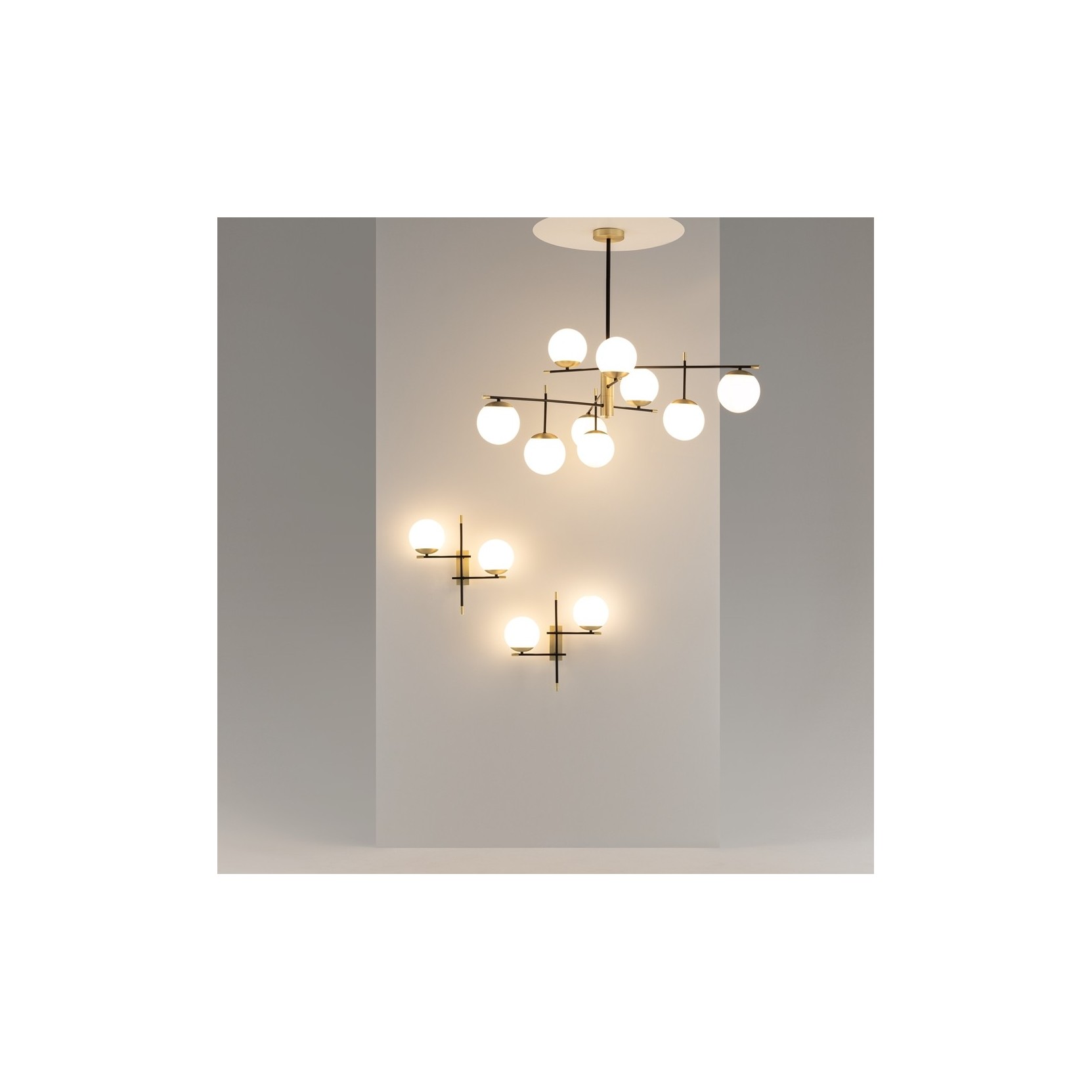 L’applique nostalgia è una lampada da parete che interpreta il minimalismo contemporaneo attraverso un gioco di linee e volumi ispirato alle orbite celesti. Caratterizzata da una struttura a "incrocio", questa lampada combina l'eleganza dell'oro satinato con il rigore del nero opaco, creando un pezzo di design dal forte impatto visivo.