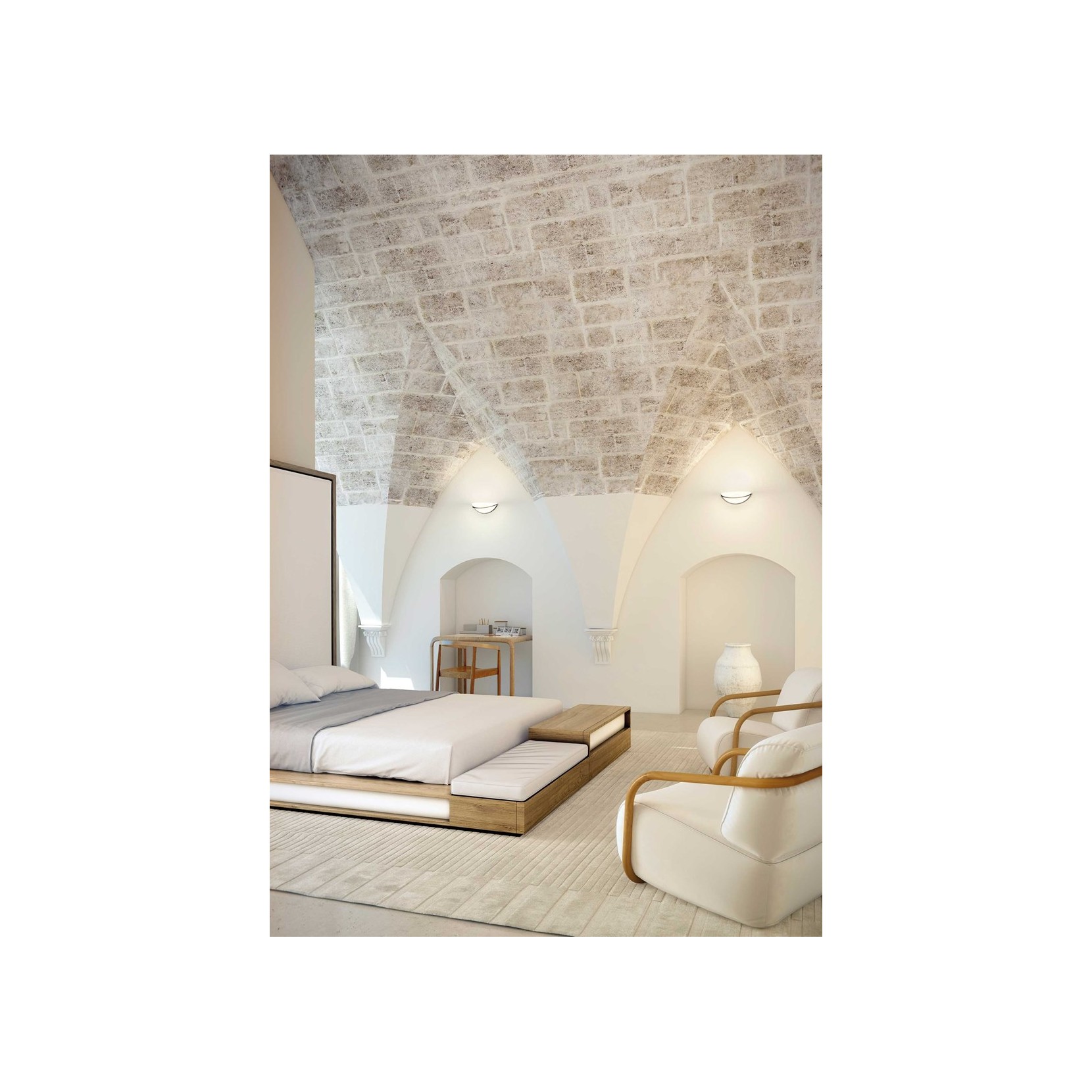 ESSENTIALS è stata progettata da Leonardo Marelli per Estiluz. Una applique da parete composta da una struttura metallica rifinita in nichel o oro e che sostiene con cura un vetro bianco satinato.?