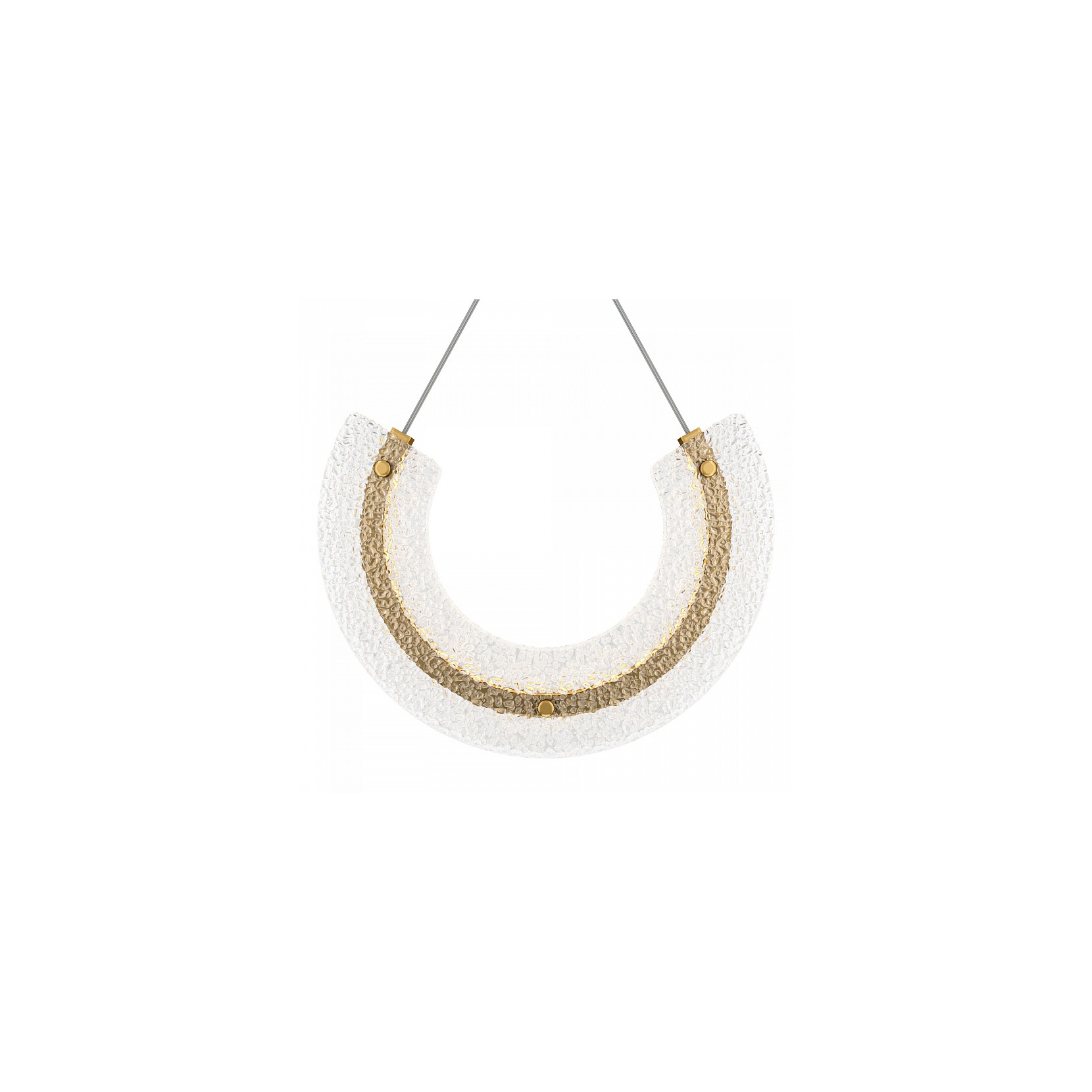 La lampada da parete MAYA vede la combinazione di due materiali: vetro e metallo. La sua particolare forma metallica si isipra al ferro di cavallo che viene avvolto da uno strato di vetro con un motivo geometrico.