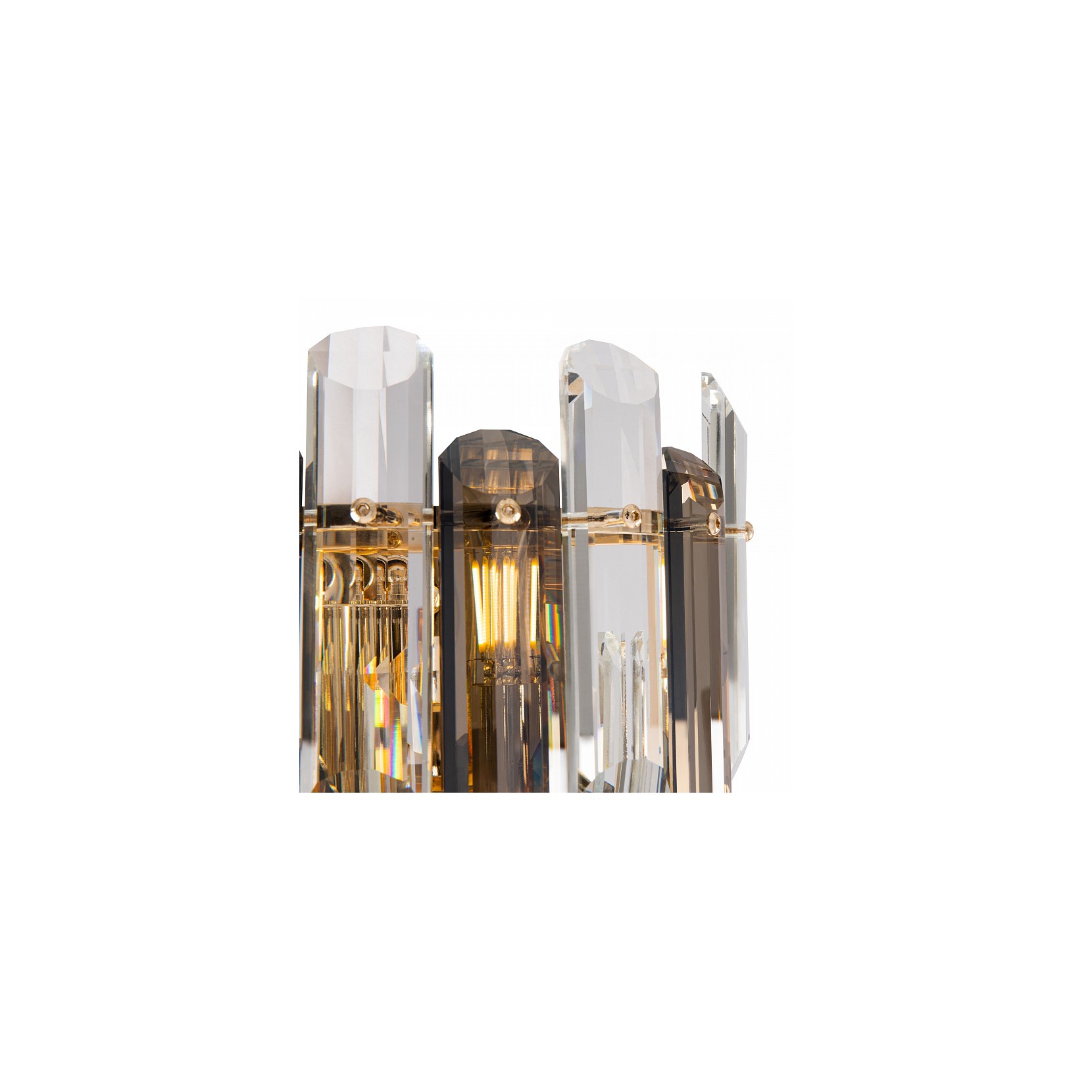 Flare è la lampada da parete con struttura in metallo nella finitura oro. La lampada è fornita di un decoro in cristallo trasparente dal motivo geometrico. Flare ha l'altezza della lampada regolabile.