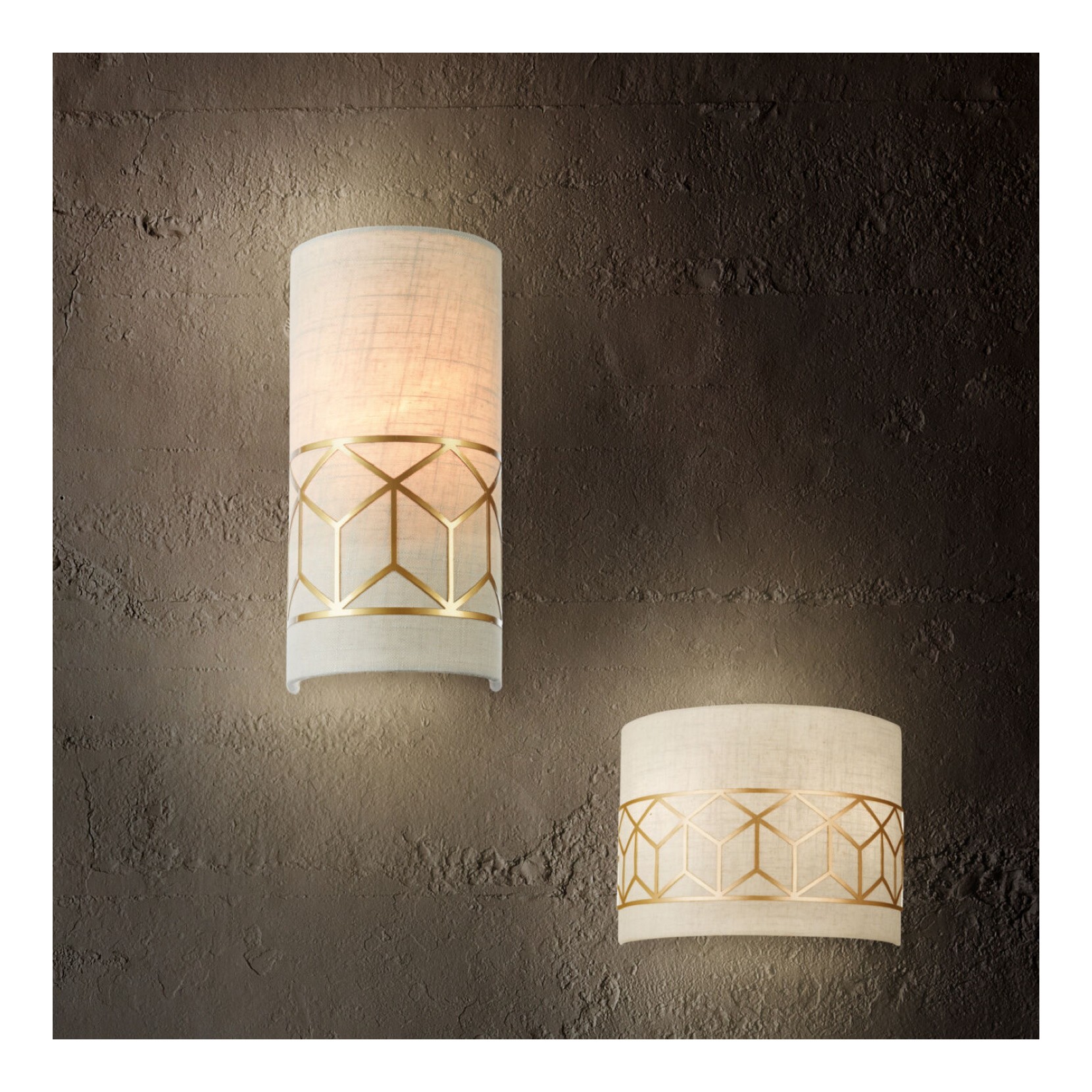 La lampada da parete MESSINA si compone di una struttura in metallo con una design che fa una chiaro riferimento ai motivi geometrici nella finitura oro. Messina con la sua struttura sembra che avvolga il paralume in PVC rivestito in tessuto come se volesse custodire un tesoro.
