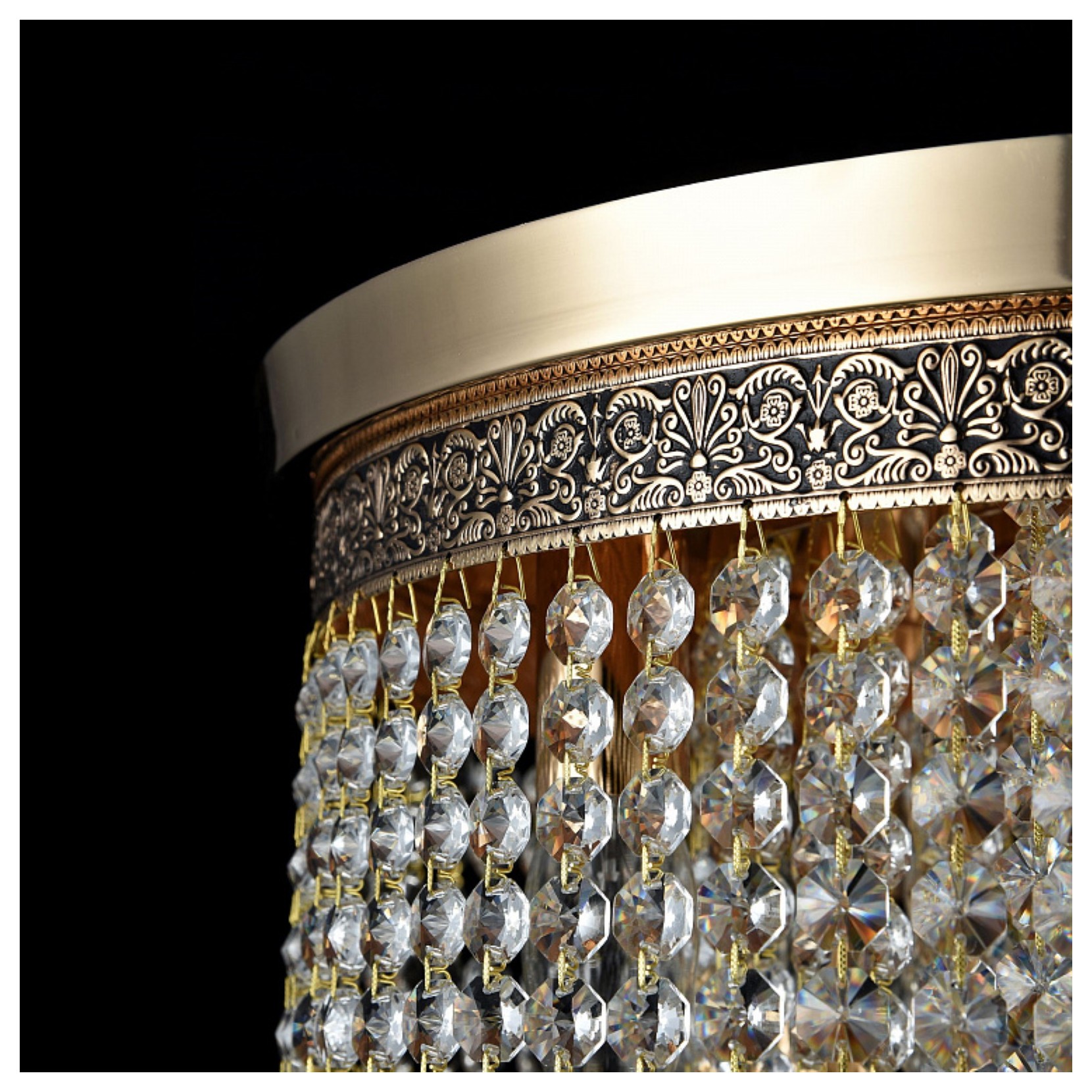 La lampada da parete CASCADE è un elogio all'eleganza del vetro rivisitato seguendo lo stile neoclassico. La struttura della lampada lo nella finitura oro antico vede incastrati cristalli a forma ottagonale e pendenti in cristallo a motivo geometrico.